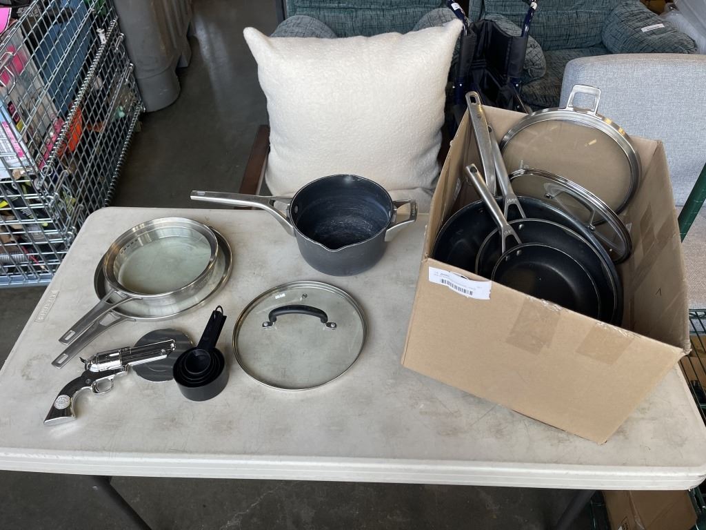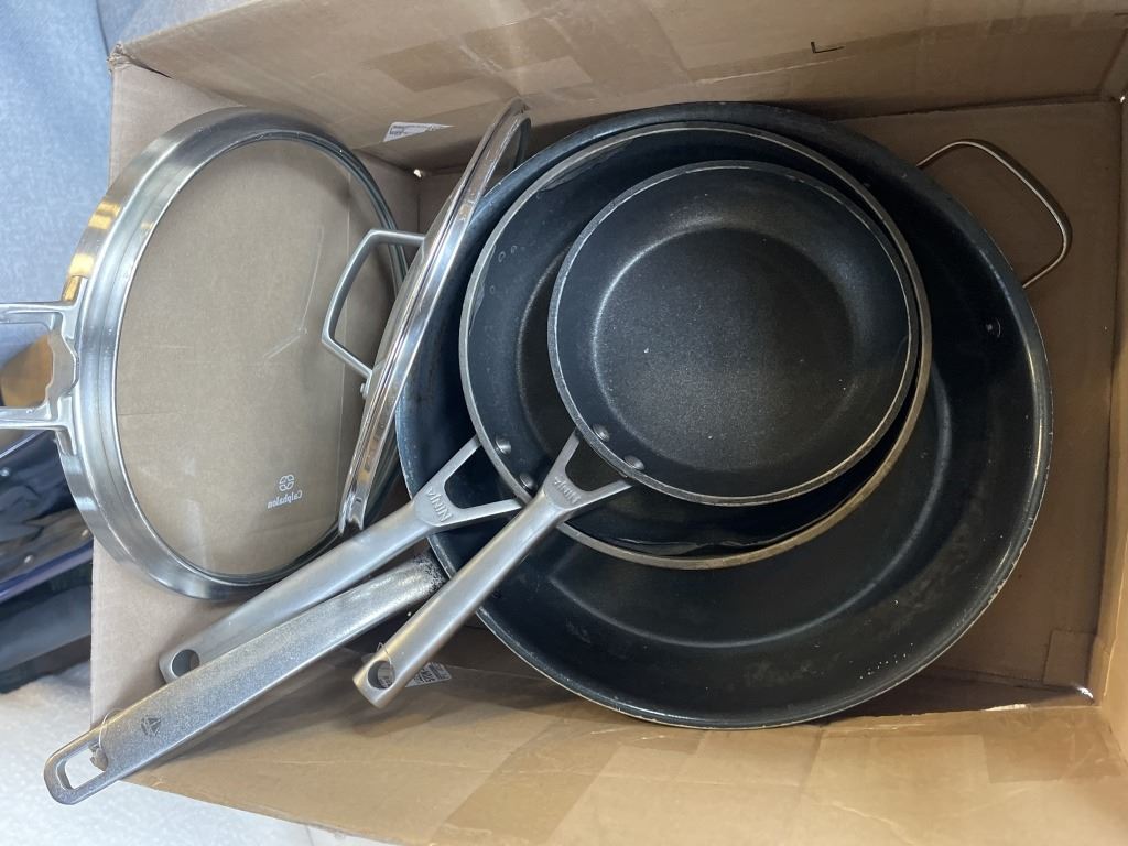 BOX OF ASSORTED COOKWARE - NINJA, BLUE DIAMOND, ETC