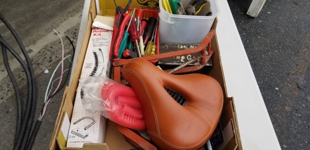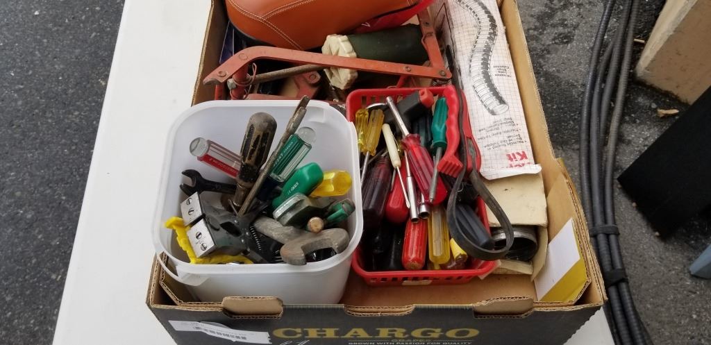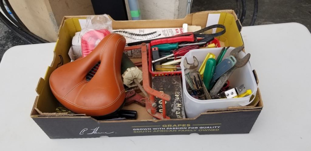 BOX OF ASSORTED HAND TOOLS, BIKE SEAT, ETC