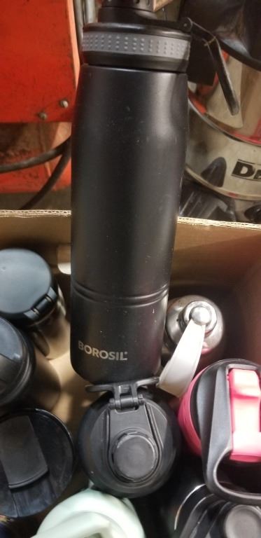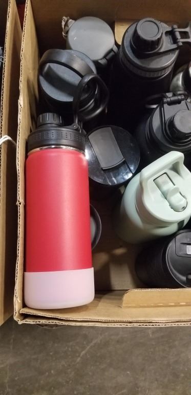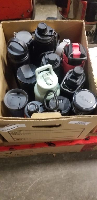 BOX OF ASSORTED INSULATED WATER BOTTLES AND MUGS