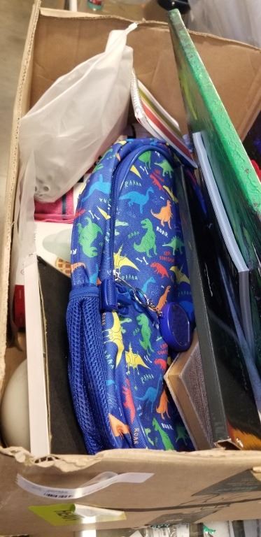 BOX OF ASSORTED NEW AND LIGHTLY USED HOUSEHOLD ITEMS, SCALE, WAFFLE MAKER, BACKPACK NEW TOWELS ETC
