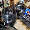BOX OF BASEBALL BAT, LIGHTSABER, AND 2 MOTORCYCLE HELMETS AND ROLLERBLADES