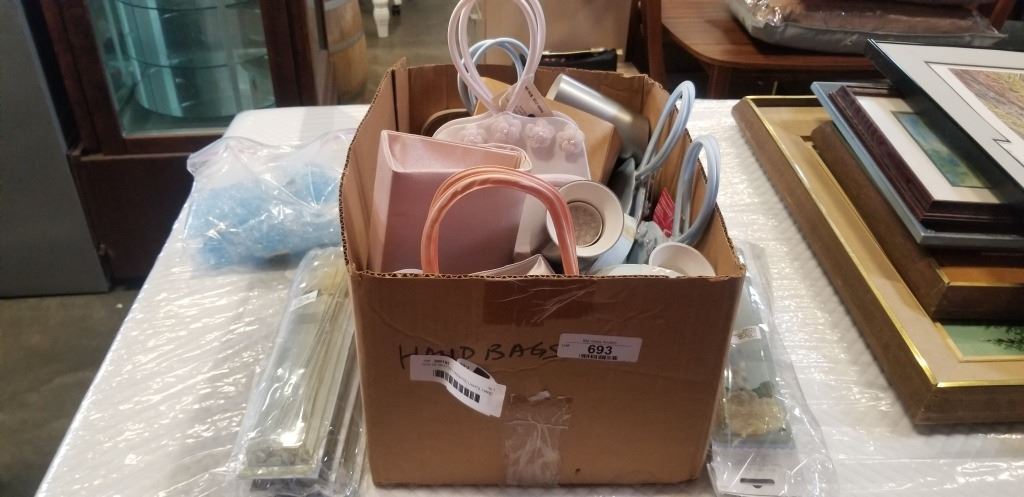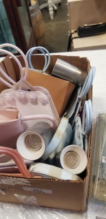 BOX OF BATTERY OPERATED LIGHTS, HAND BAGS AND MINI FRAMES
