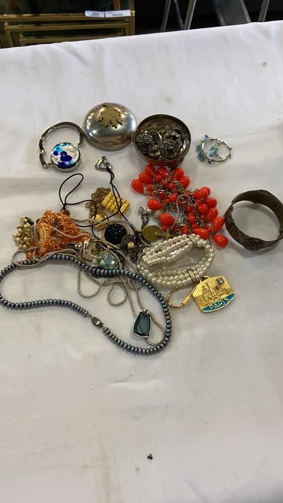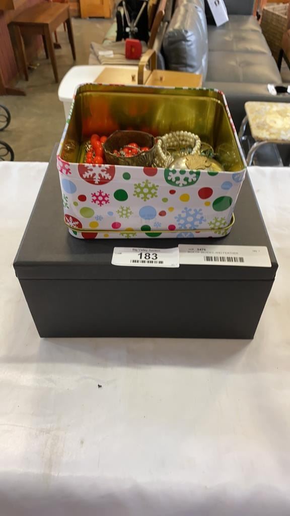BOX OF BEADED AND FEATHER JEWELLERY, AND TIN OF JEWELLERY