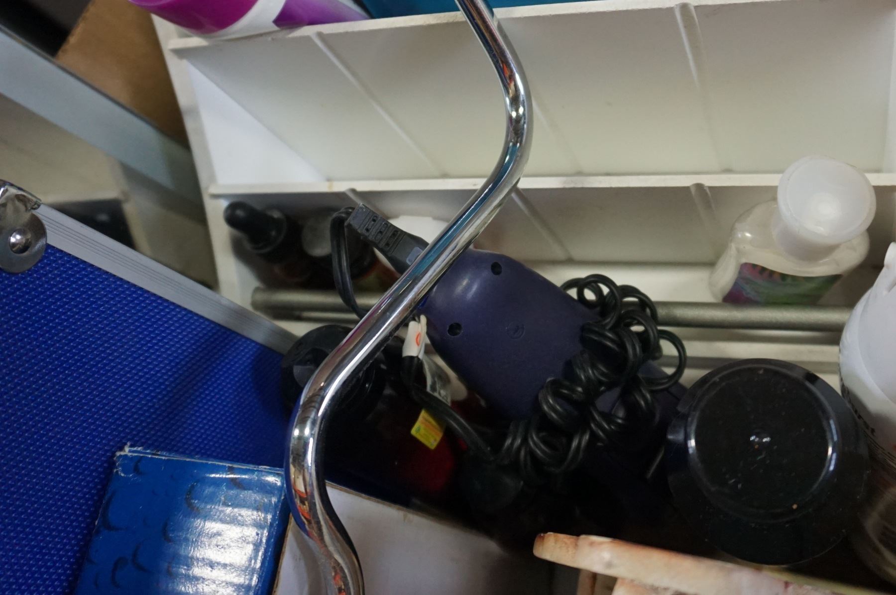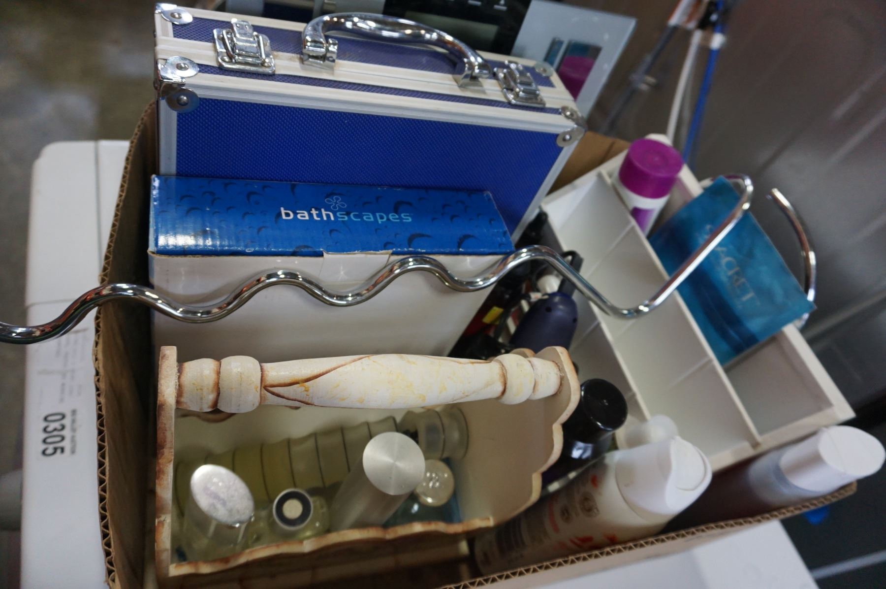 BOX OF BEAUTY PRODUCTS, BATHROOM SCALE, MIRROR, AND CASE