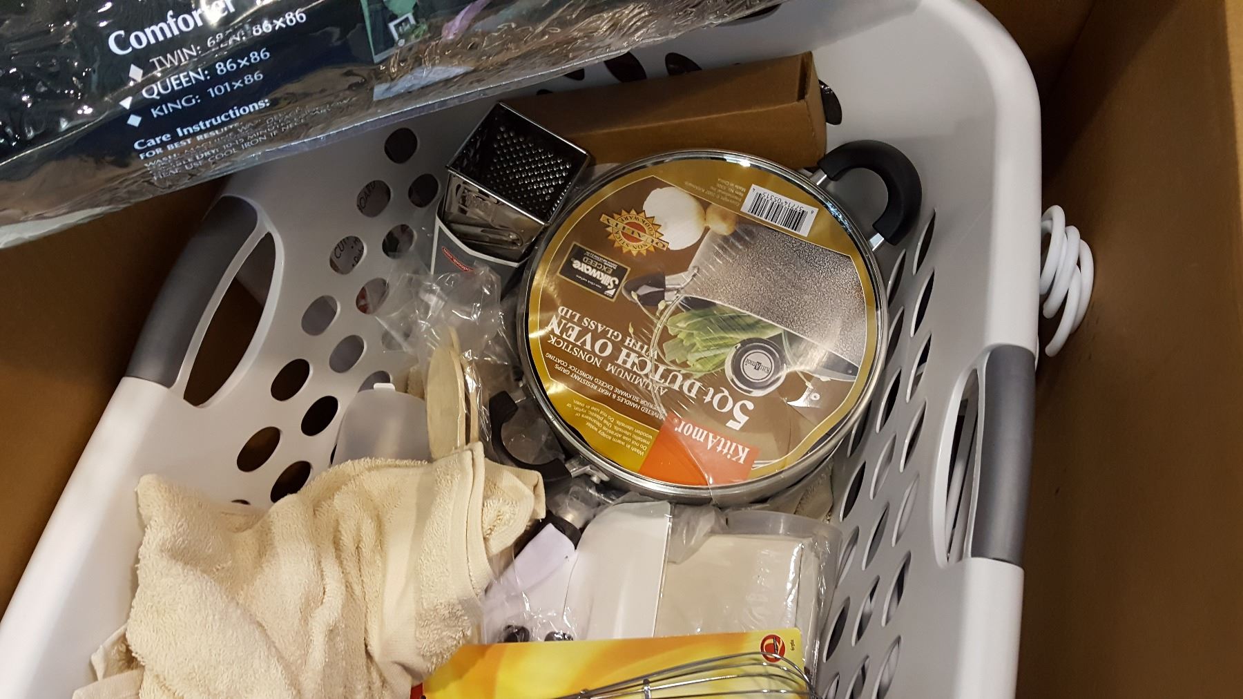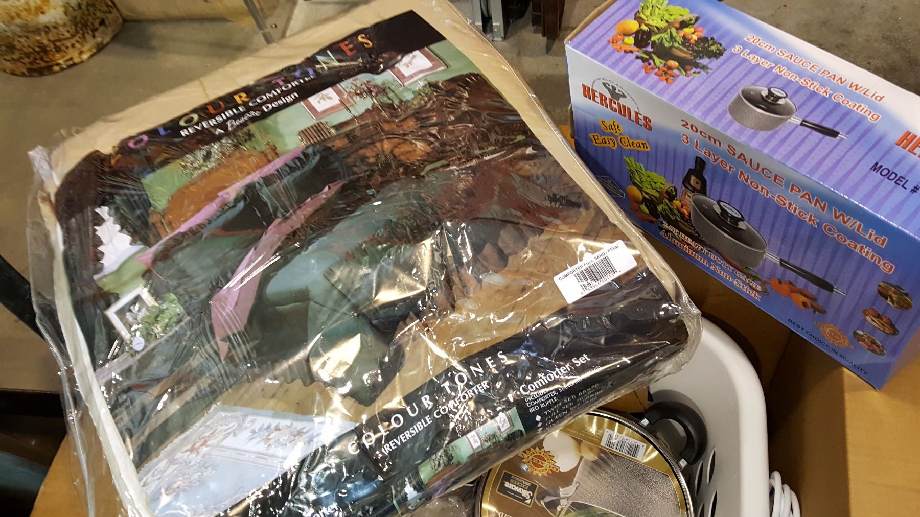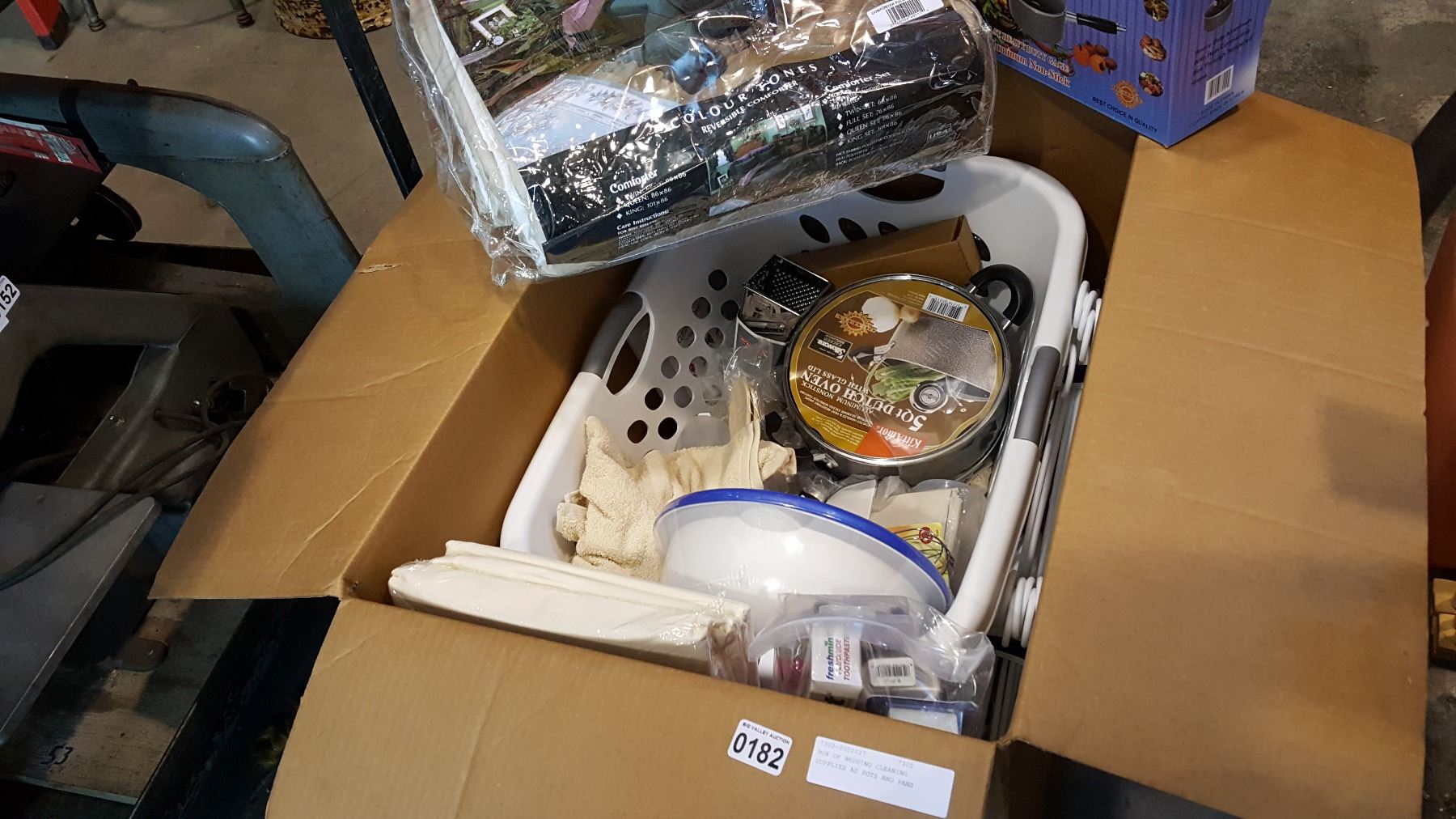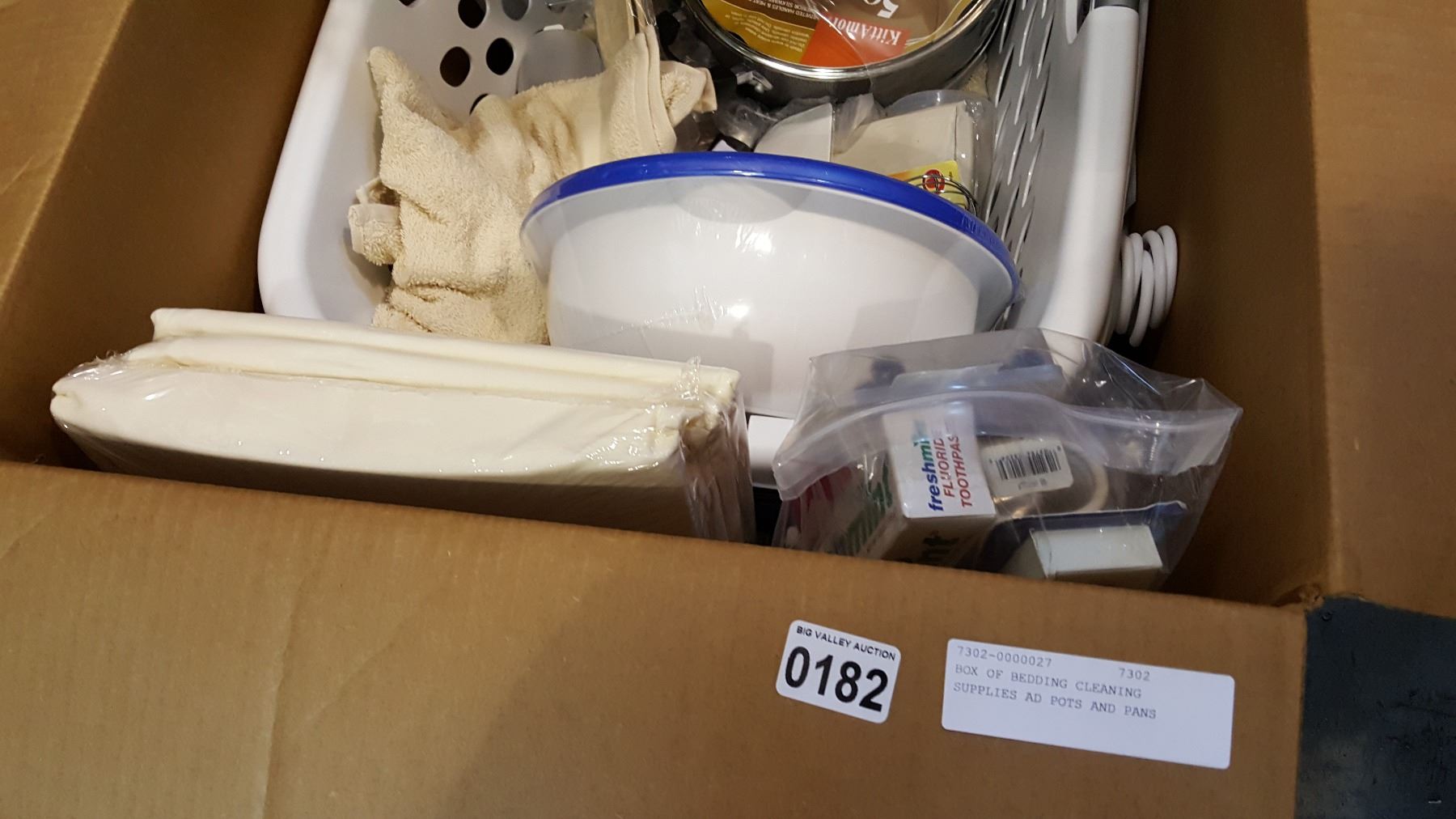 BOX OF BEDDING CLEANING SUPPLIES AND POTS AND PANS