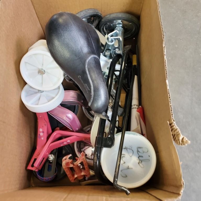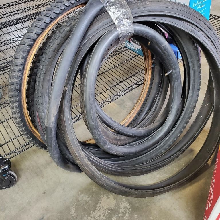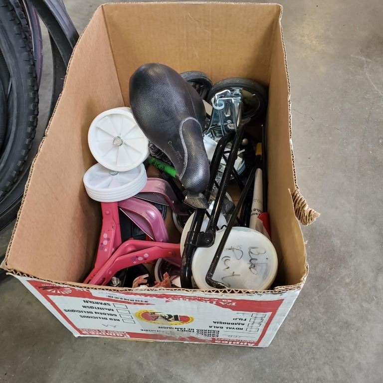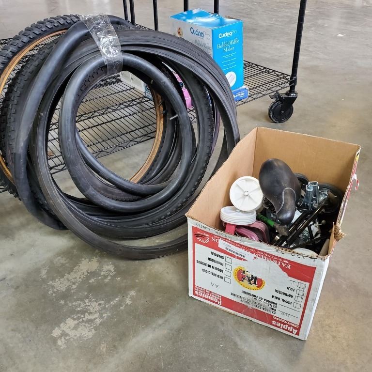 BOX OF BIKE PARTS, 6 BIKE TIRES AND 4 TUBES