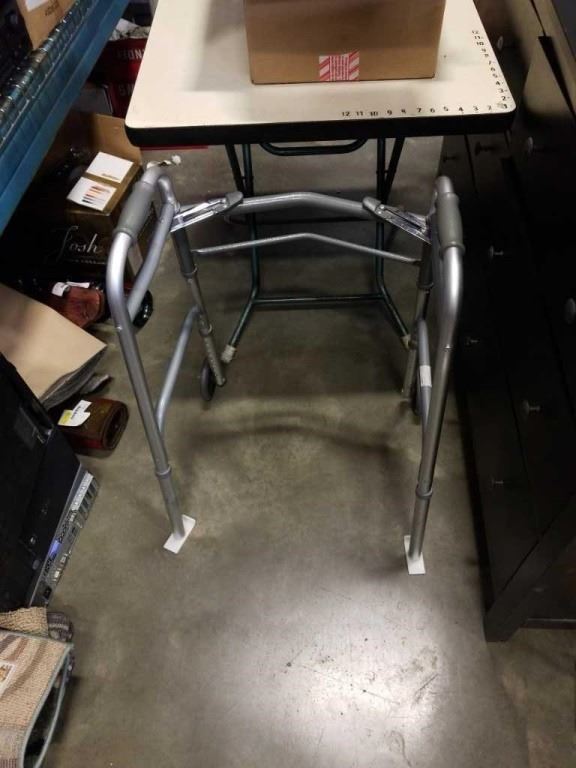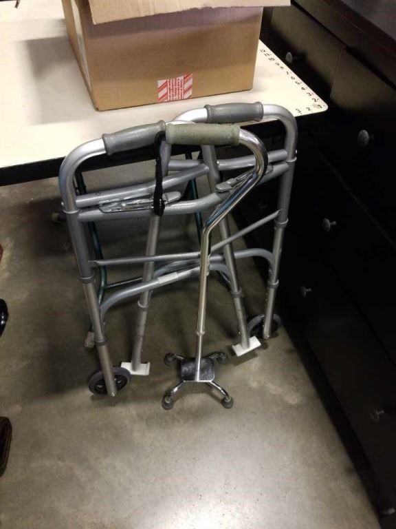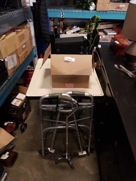 BOX OF BLACKLIGHTS, PIONEER SPEAKERS, FOLDING WALKER AND CANE