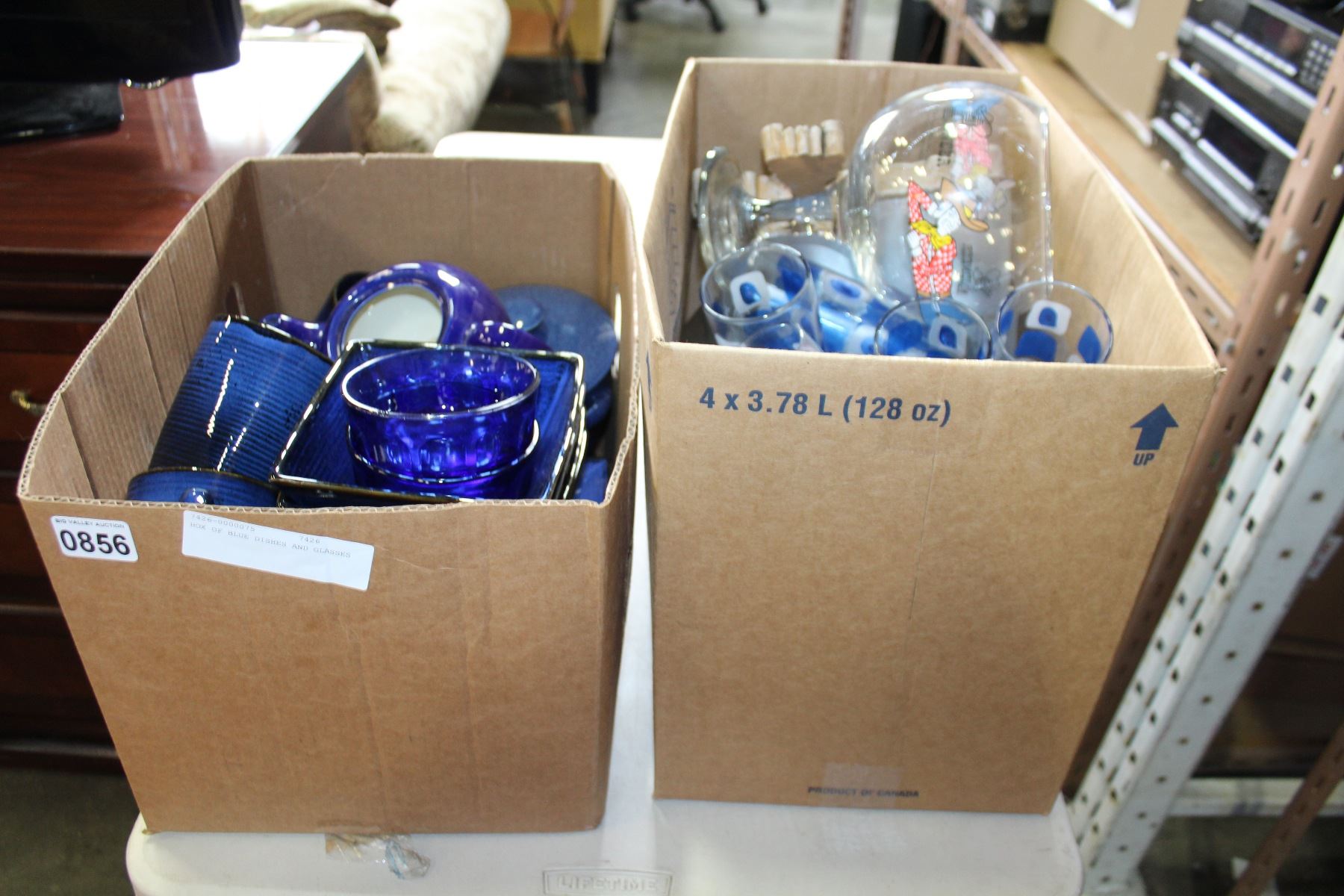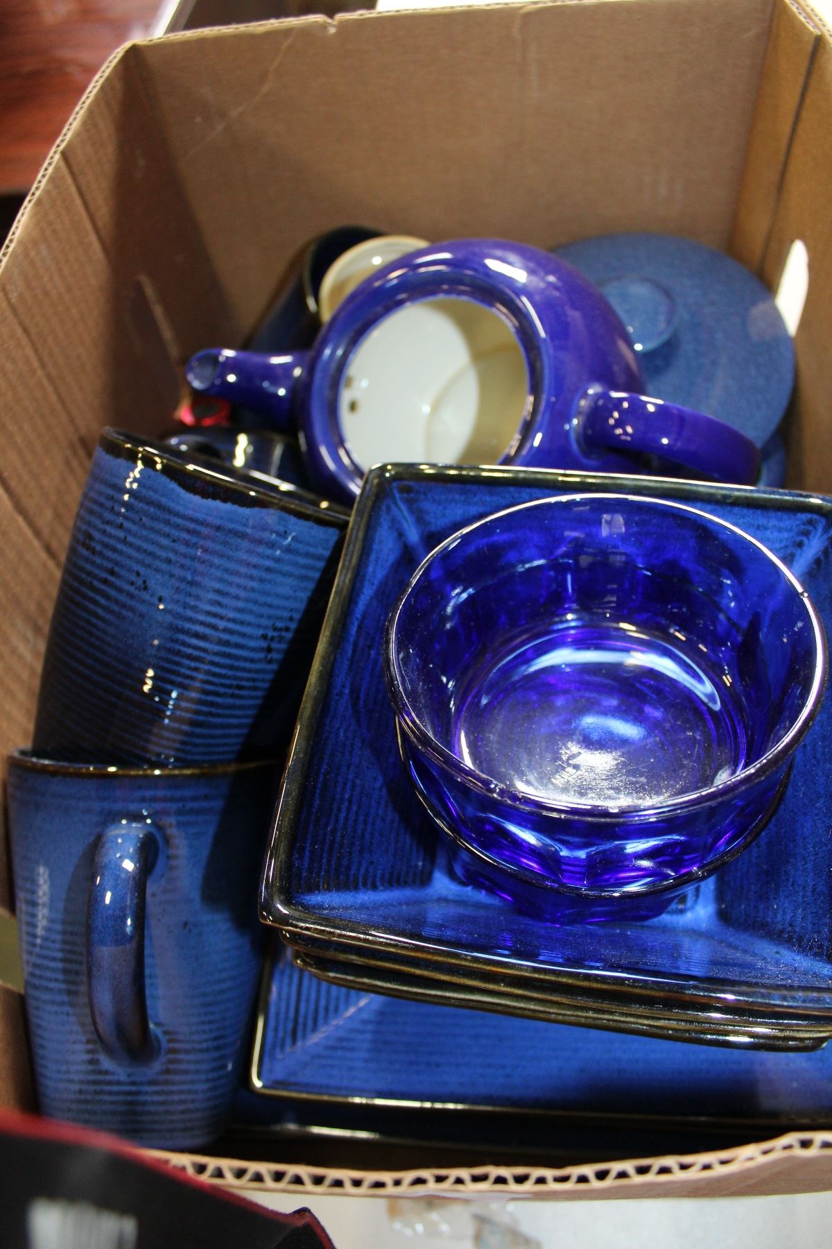 BOX OF BLUE DISHES AND GLASSES