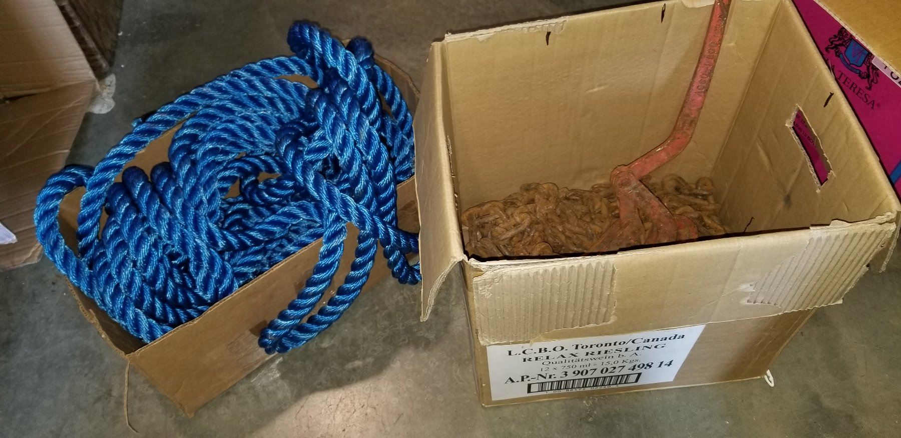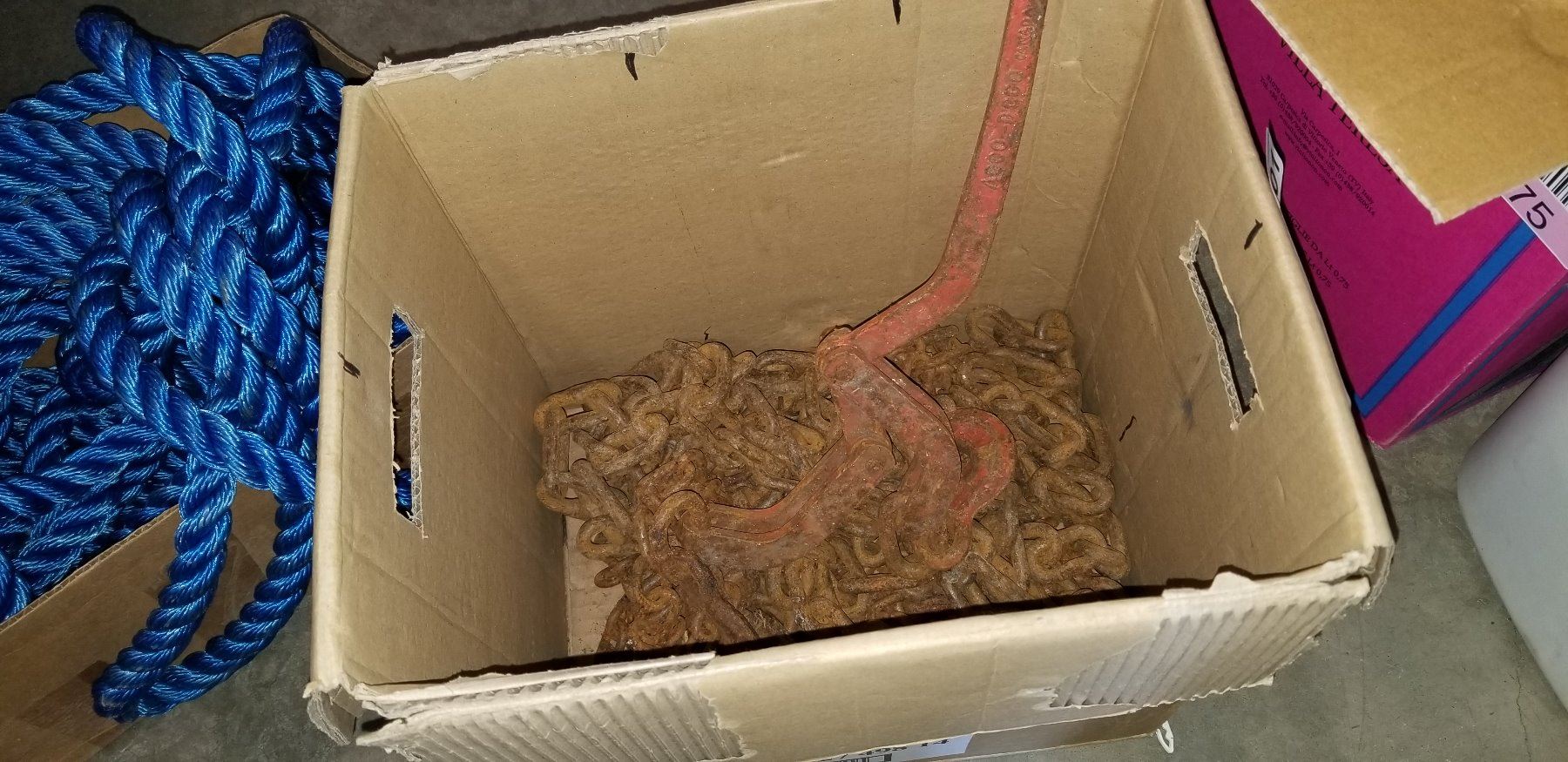BOX OF BLUE HEAVY DUTY ROPE, METAL CHAIN, AND CINCH
