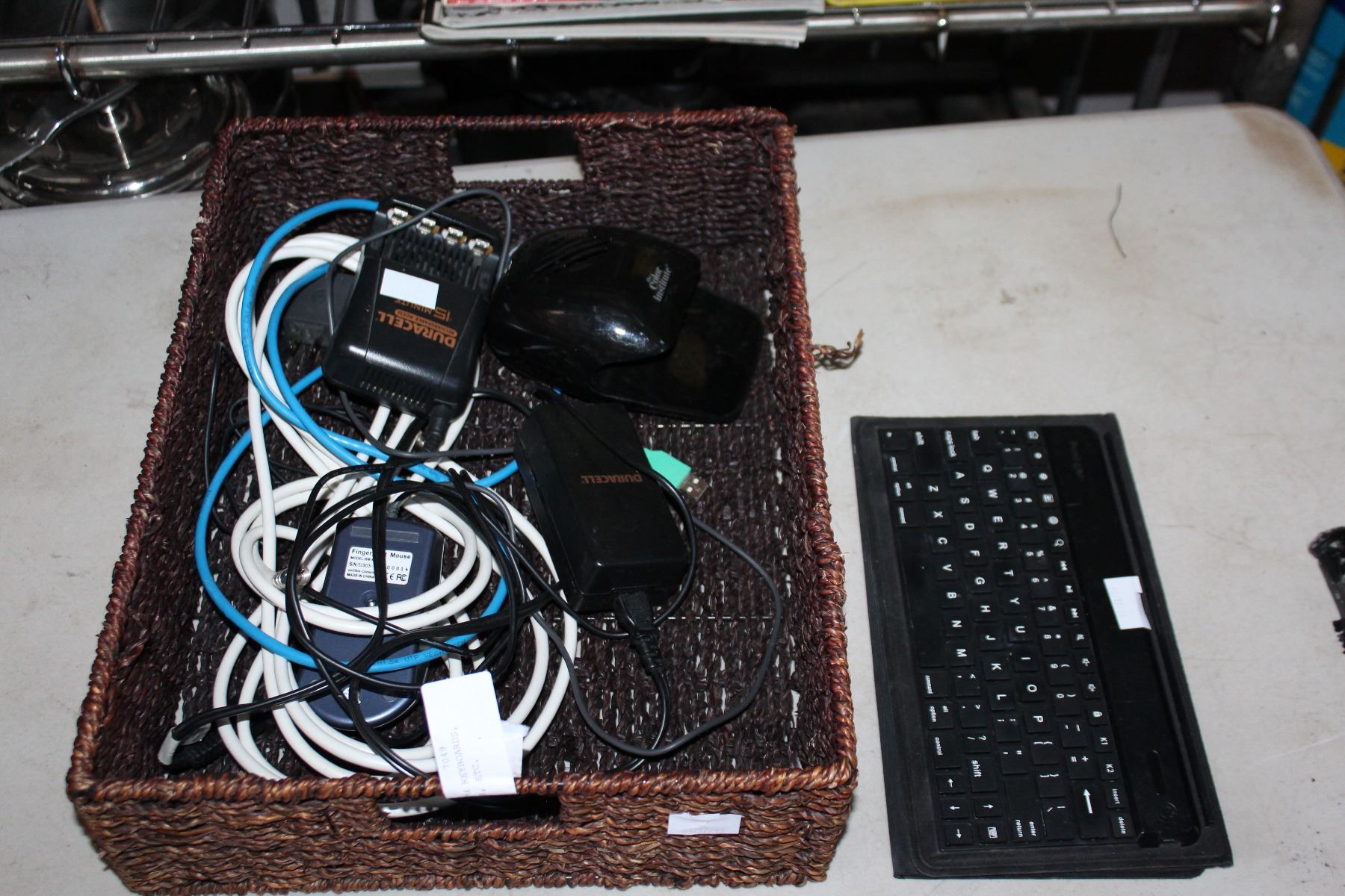 BOX OF BLUETOOTH KEYBOARDS, BATTERY CHARGER, ETC.