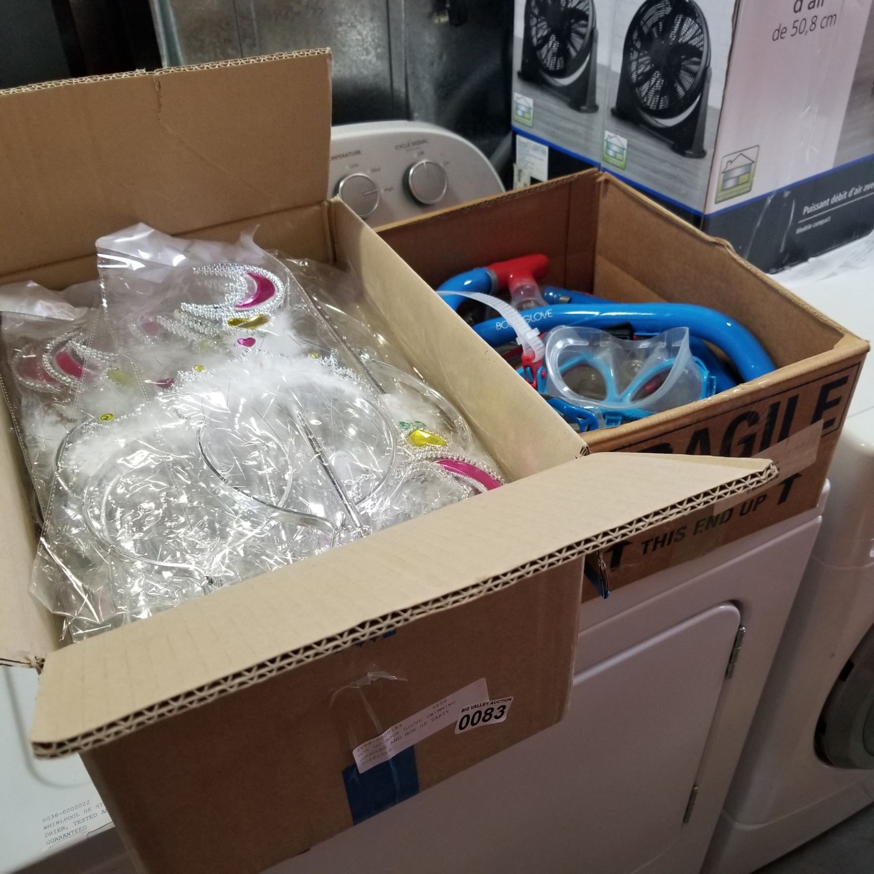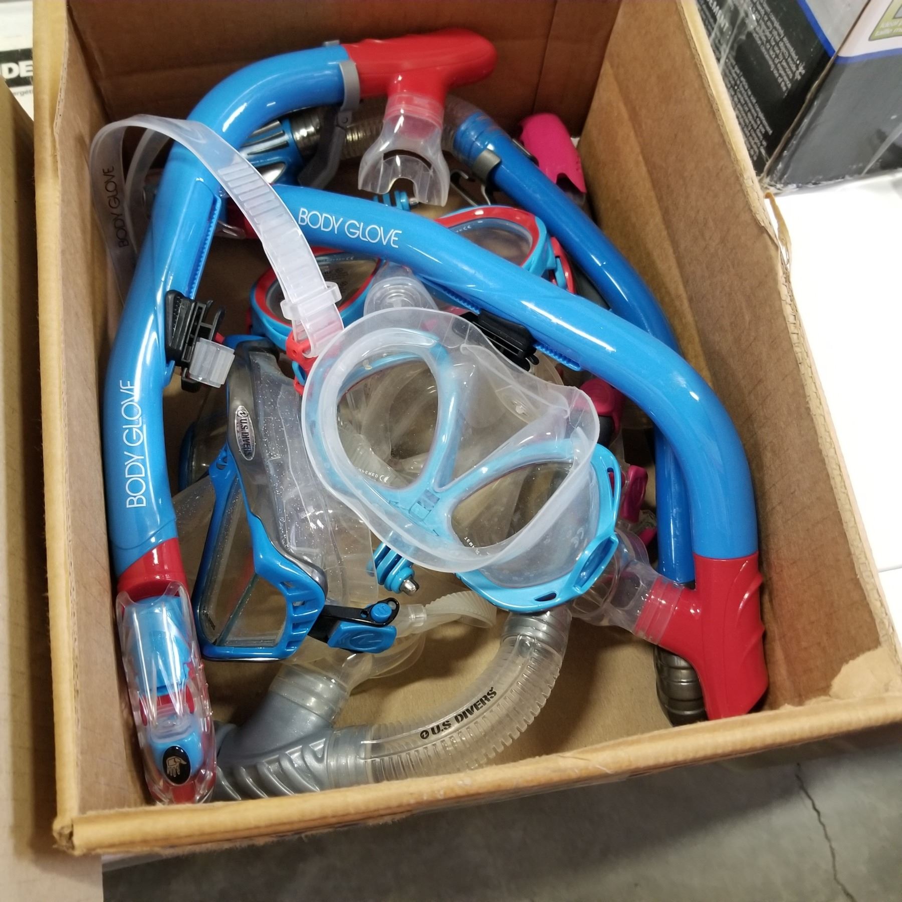 BOX OF BODY GLOVE SWIMMING GOGGLES AND BOX OF PARTY SUPPLIES