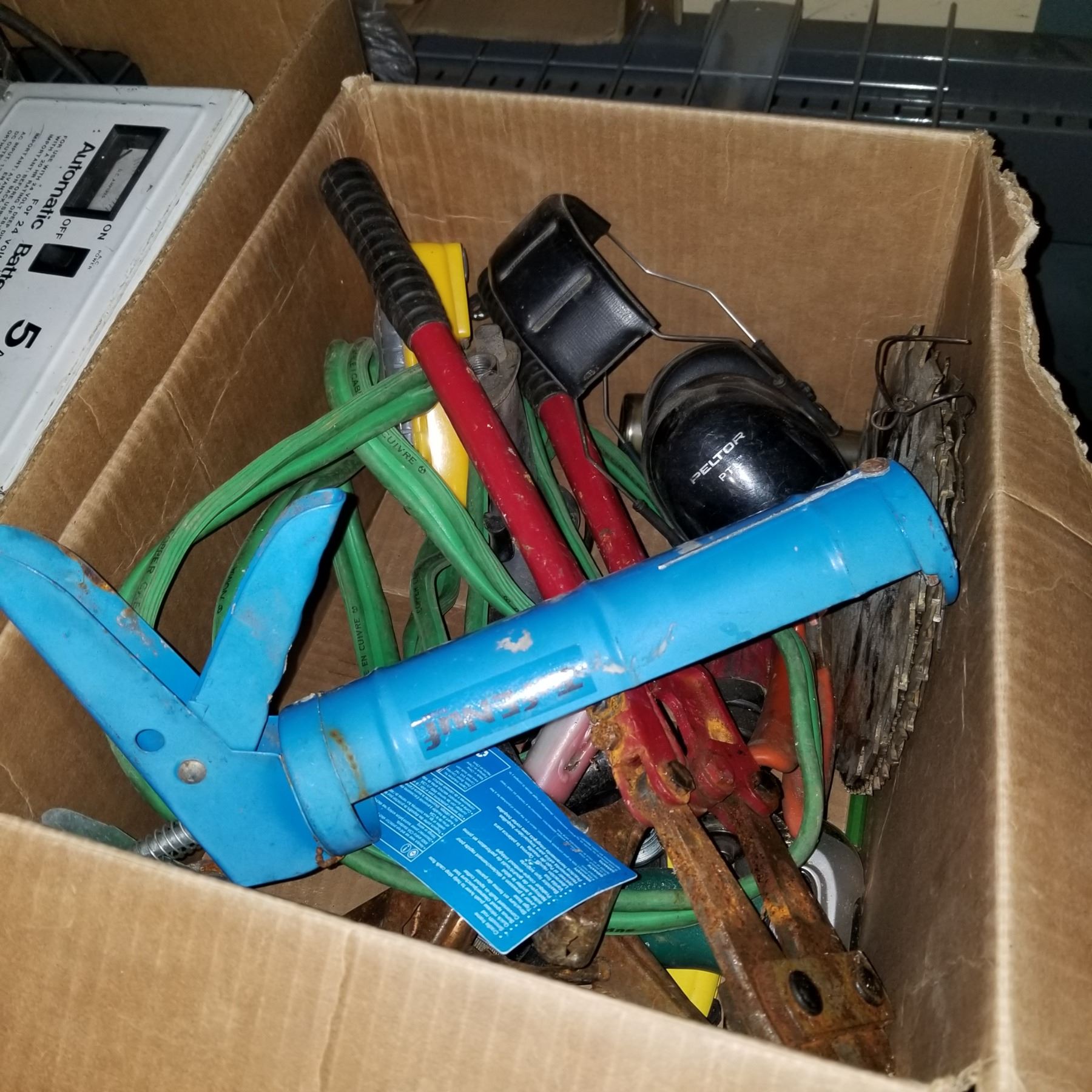 BOX OF BOLT CUTTERS, MASKING TAPE, AND EAR PROTECTION