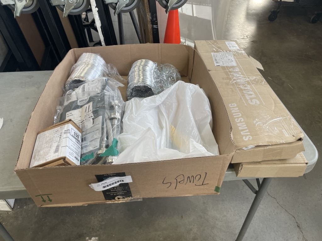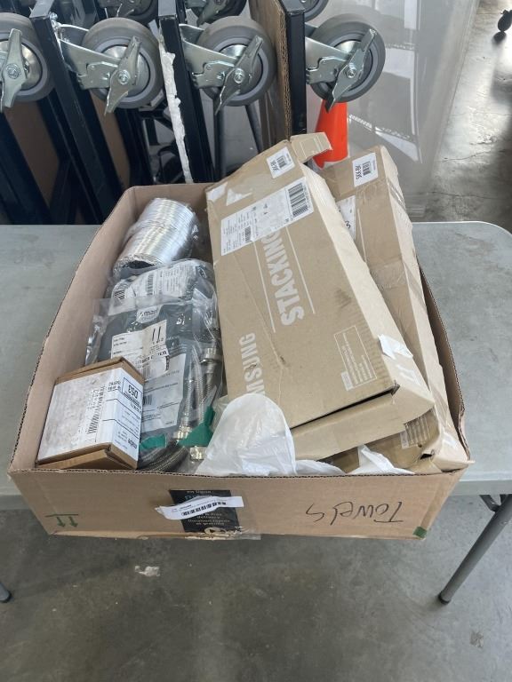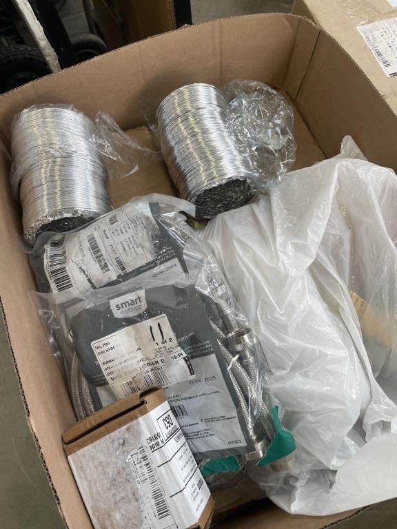 BOX OF BRAIDED WASHER FILL HOSES, DRYER EXHAUST HOSES AND STACKER KITS