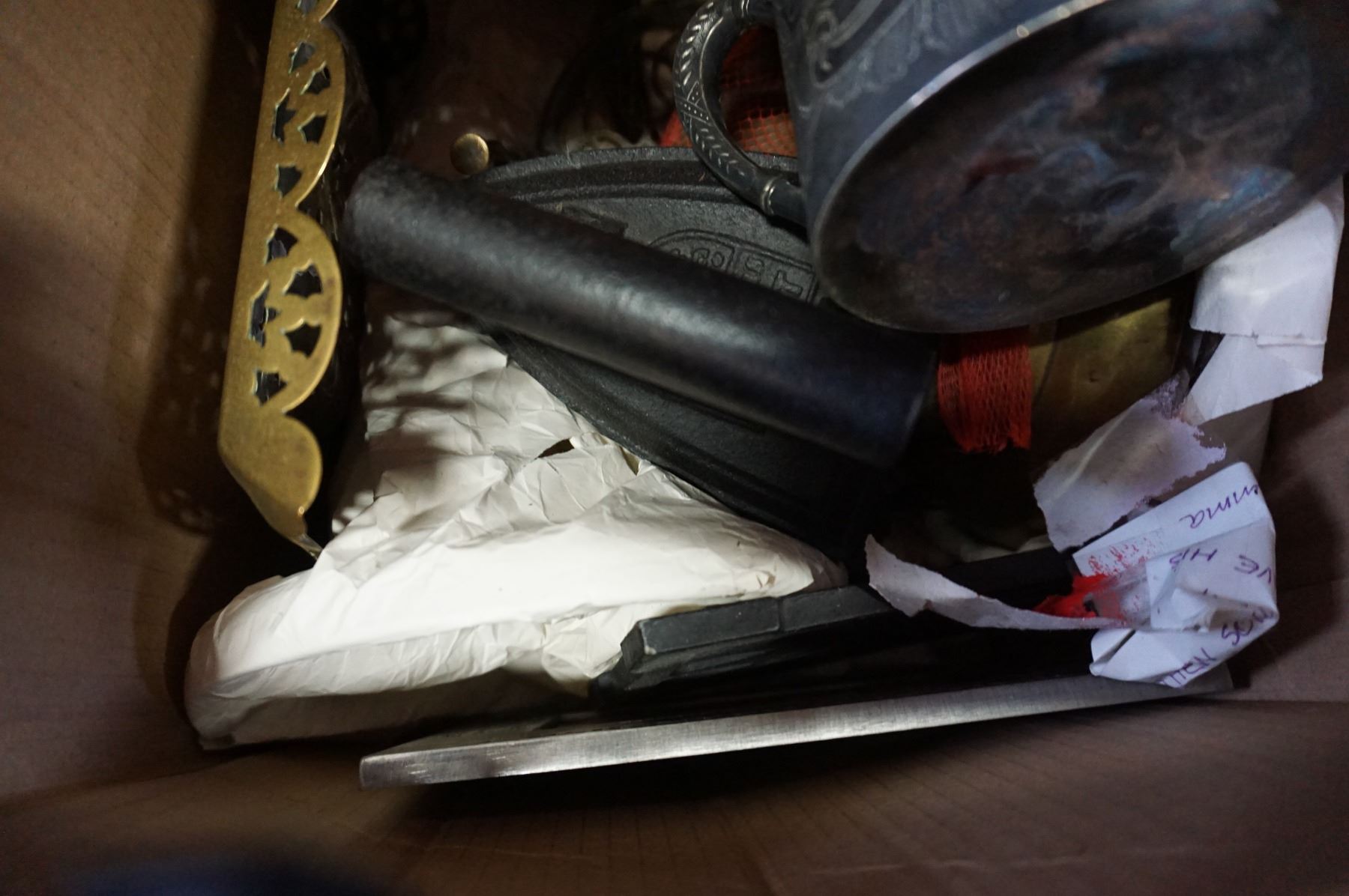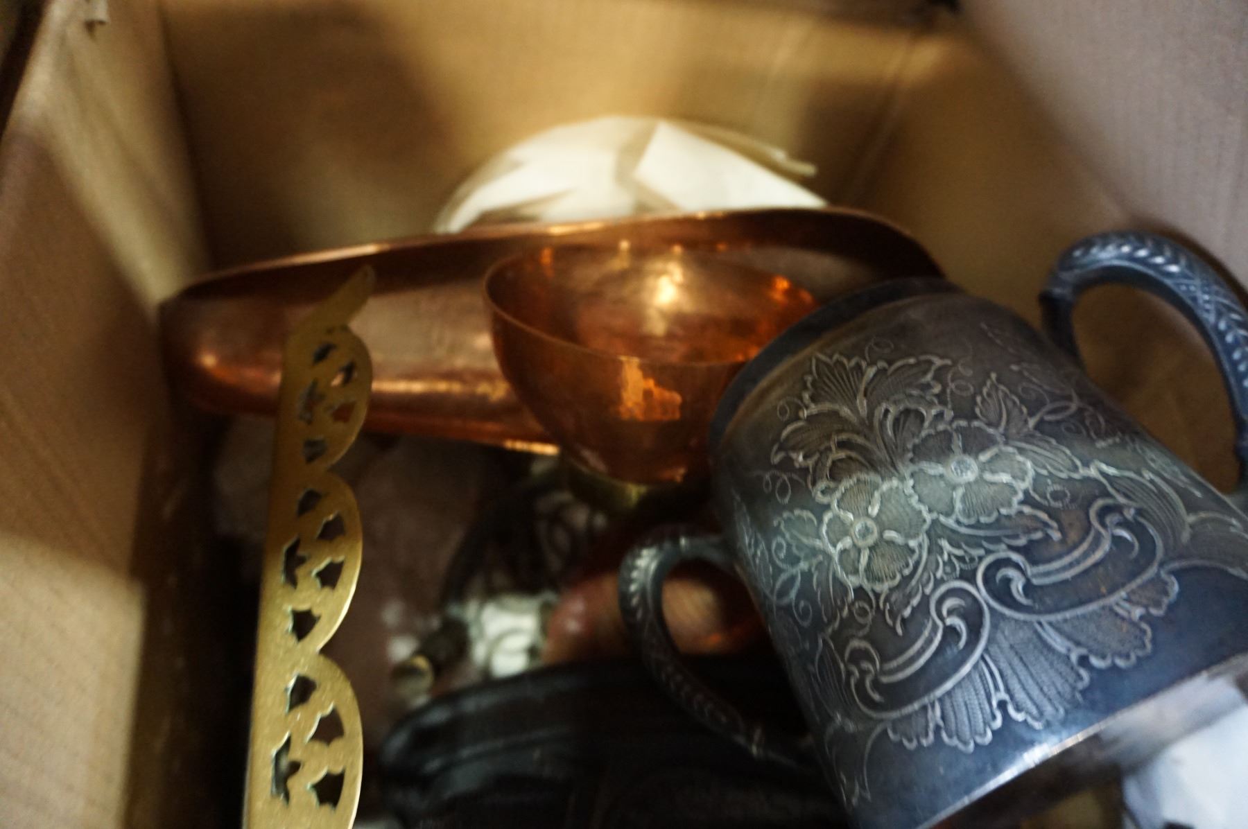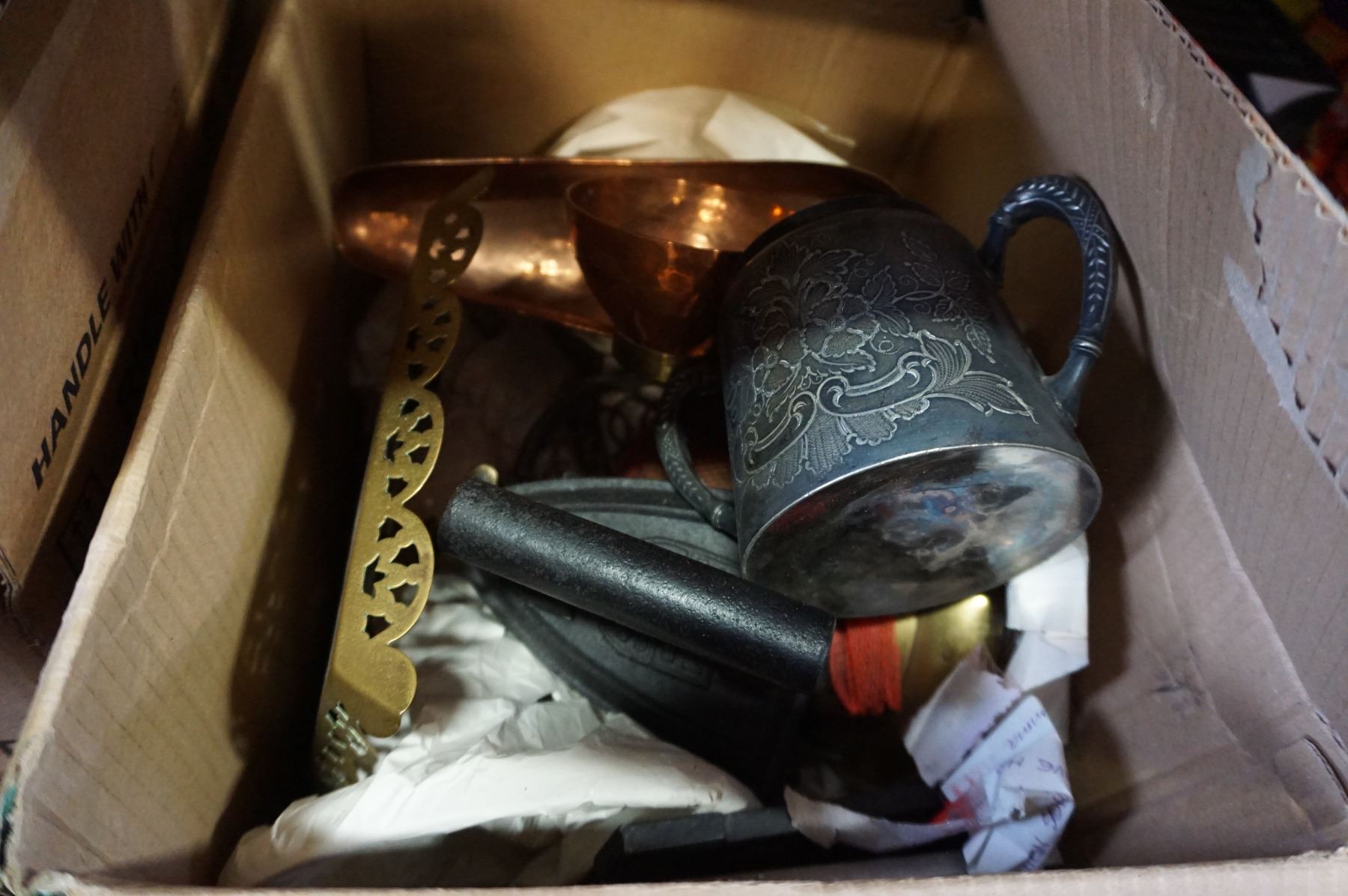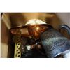 BOX OF BRASS AND COPPER DISHES, BOWLS, SAT IRON
