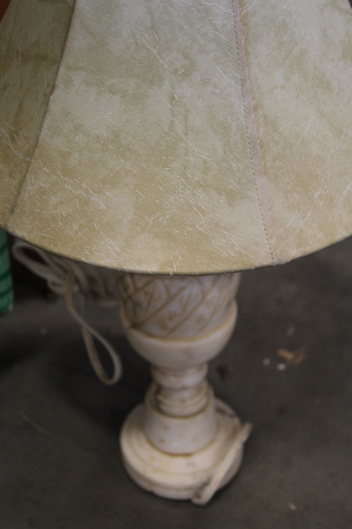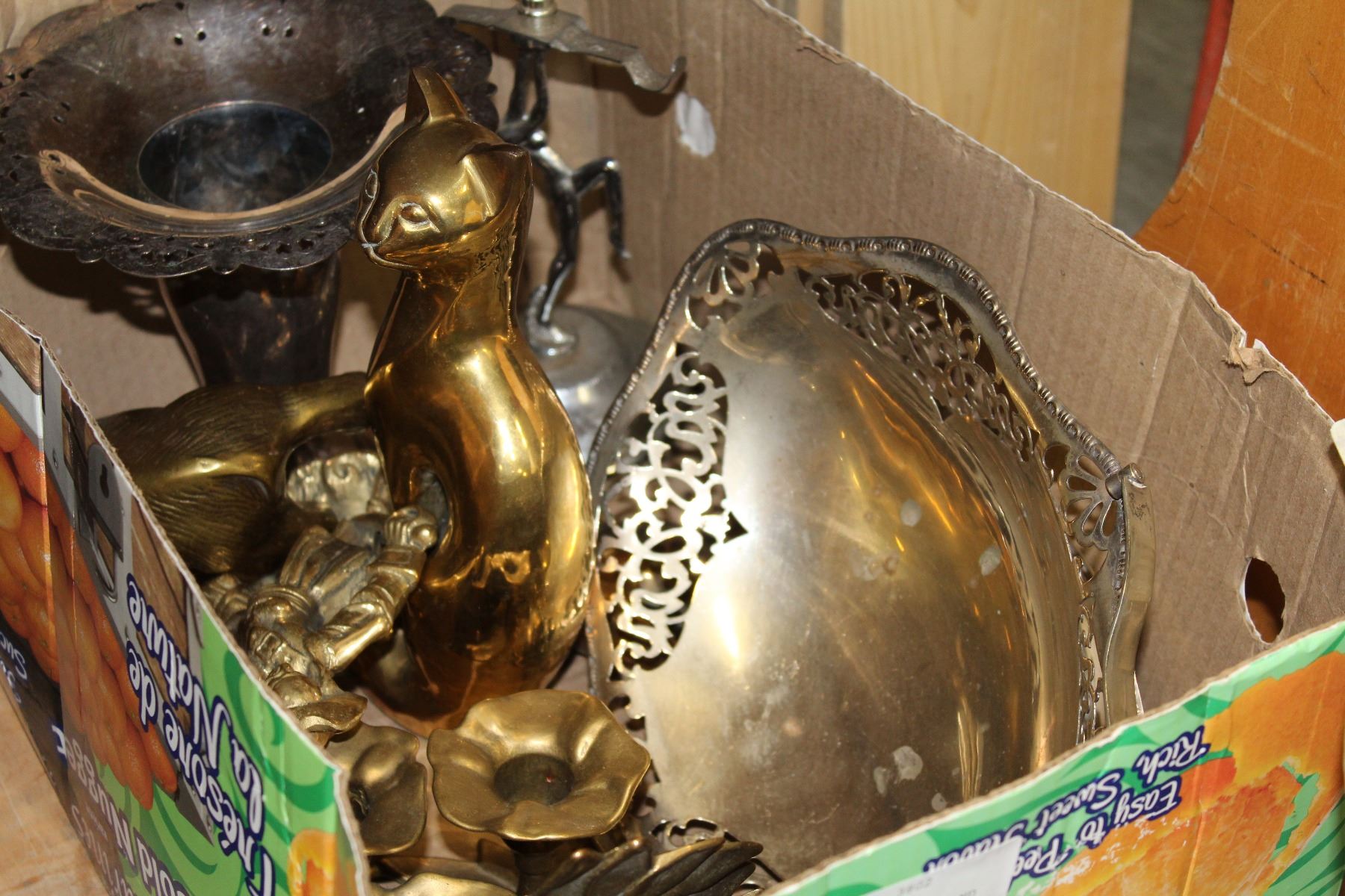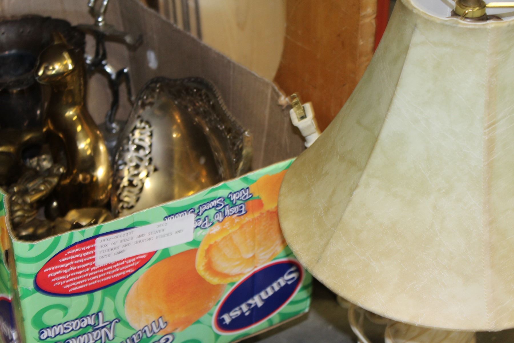 BOX OF BRASS AND SILVER FIGURES AND SERVING PIECES AND ONYX LAMP