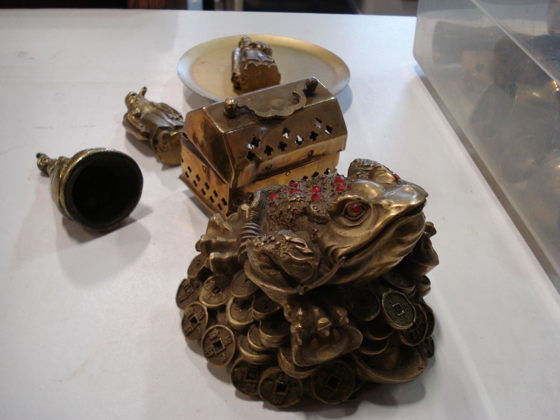 BOX OF BRASS ORANMENTS FROG CATS AND FIGURES