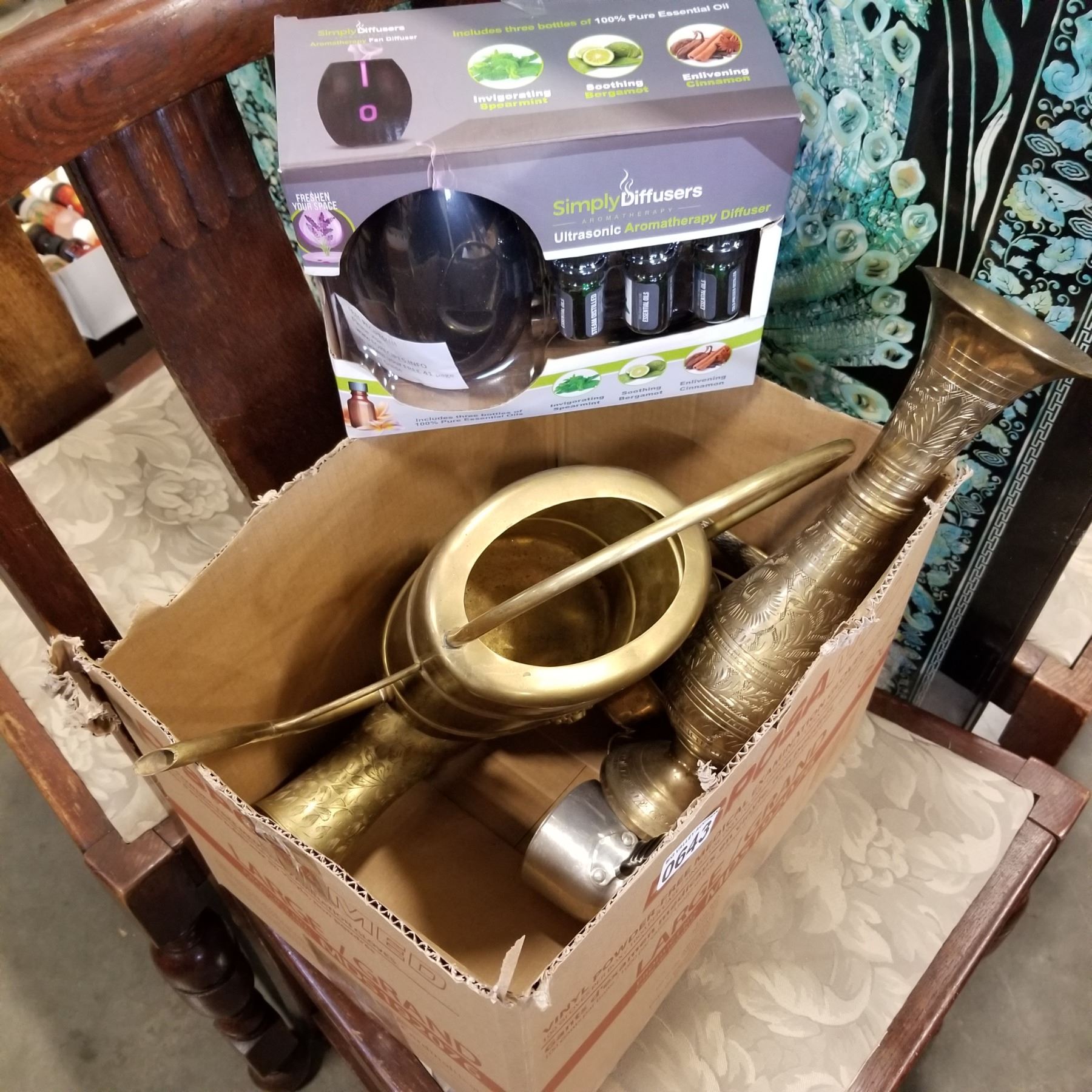 BOX OF BRASSWARE, VASES AND SIMPLY DIFFUSERS AROMATHERAPY