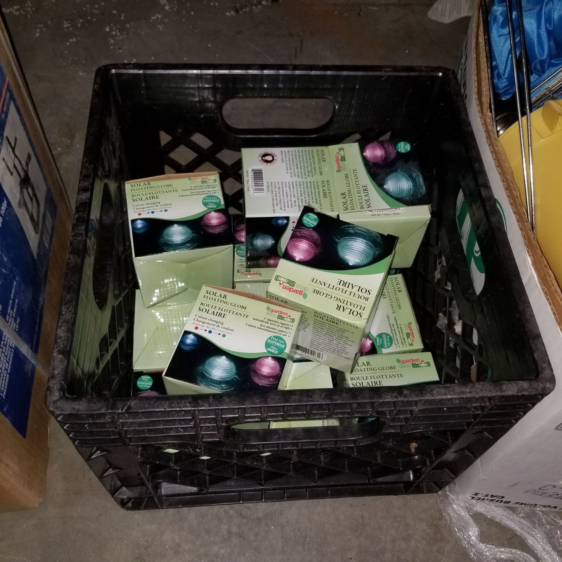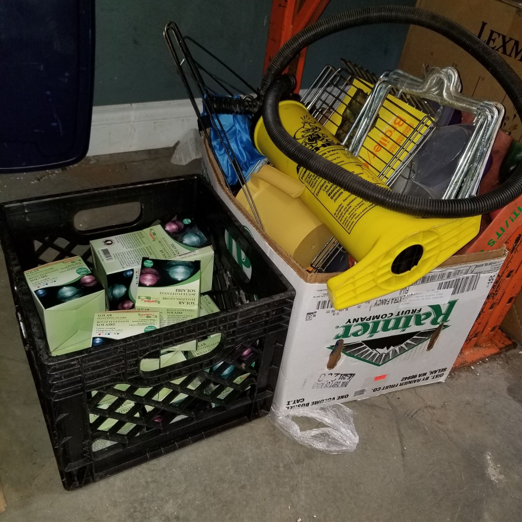 BOX OF CAMPING RELATED ITEMS AND SUPPLIES IN POOL FLOATING GLOBES