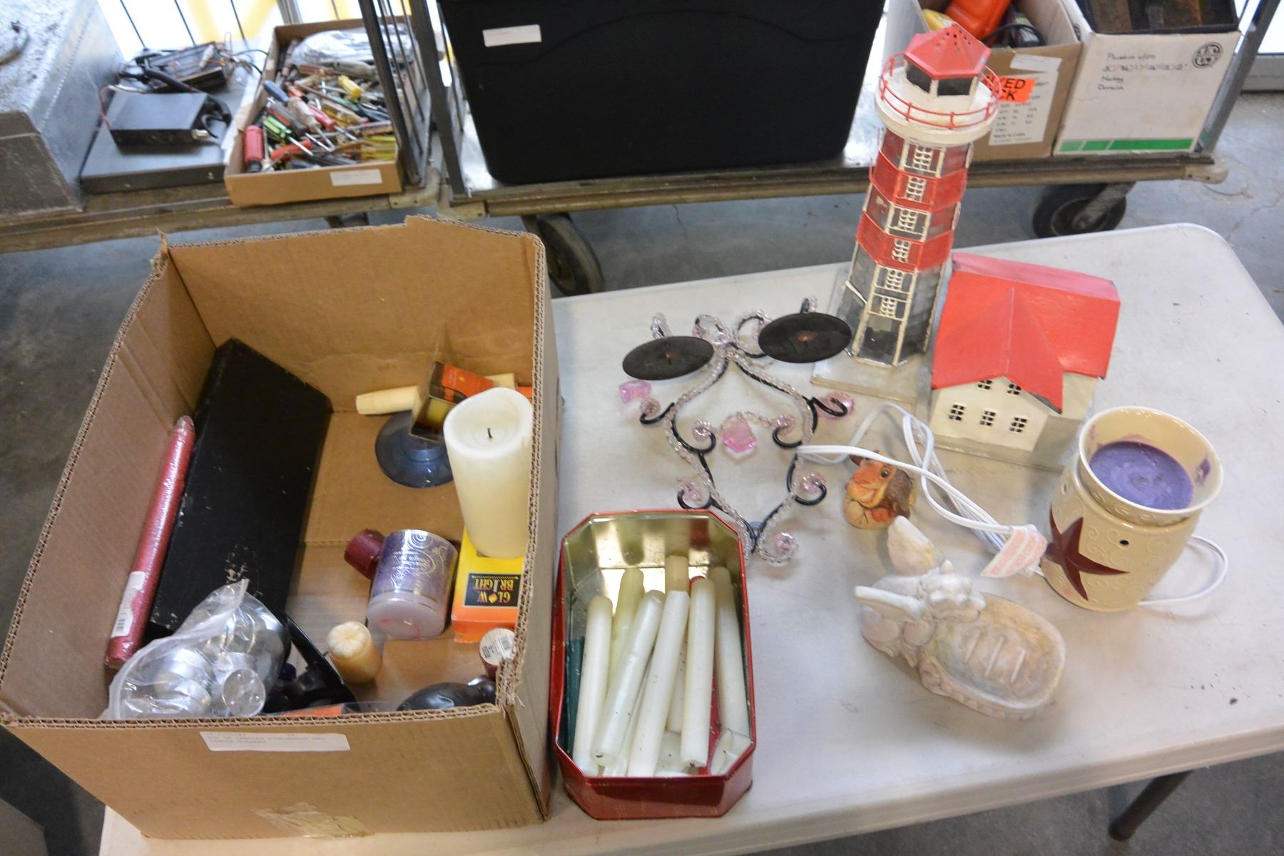 BOX OF CANDLES LIGHTHOUSE AND CANDLE HOLDERS