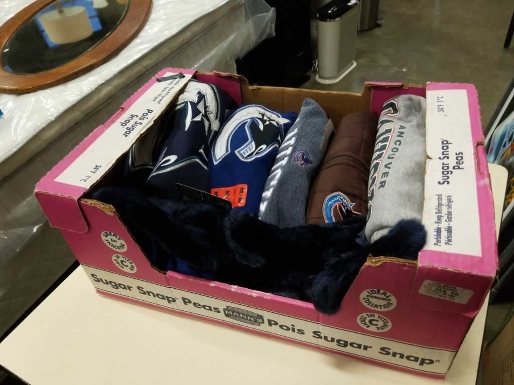 BOX OF CANUCKS CLOTHING AND COLLECTABLES