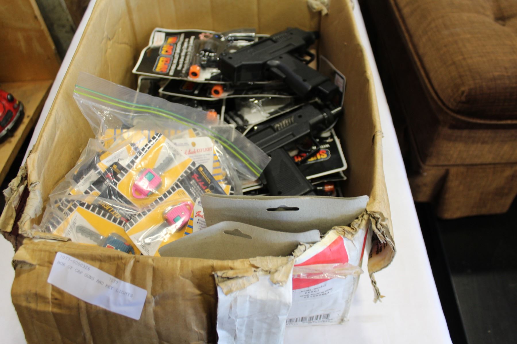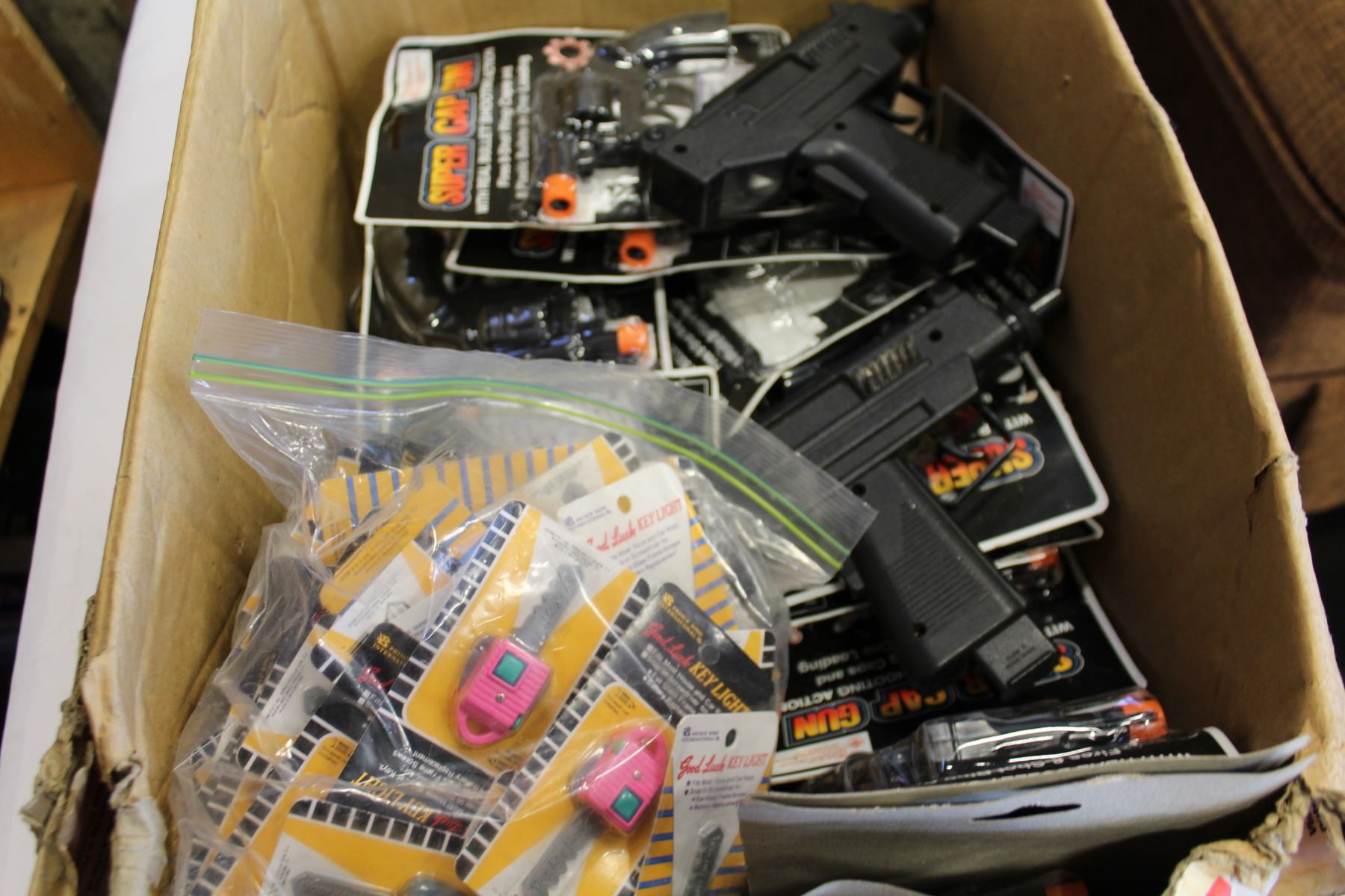 BOX OF CAP GUNS AND KEY LIGHTS