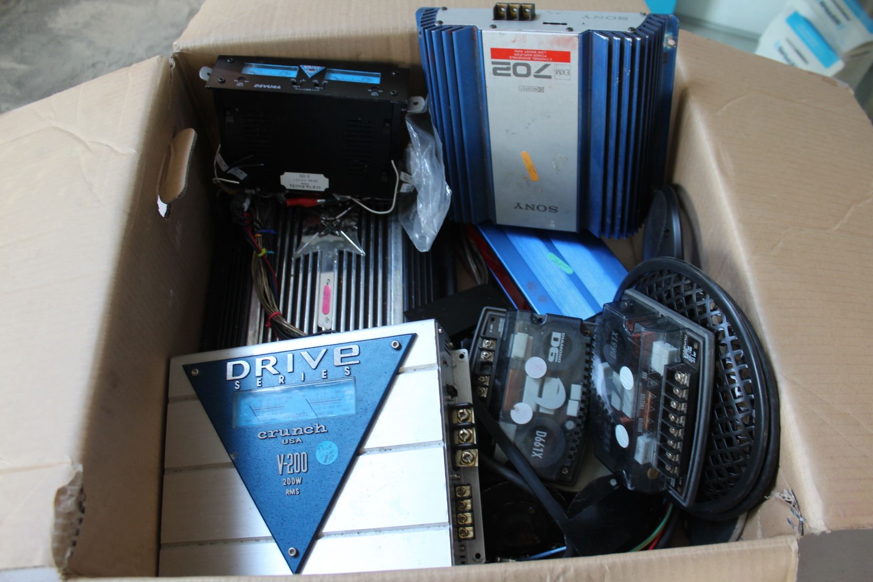 BOX OF CAR AUDIO AMPS ETC