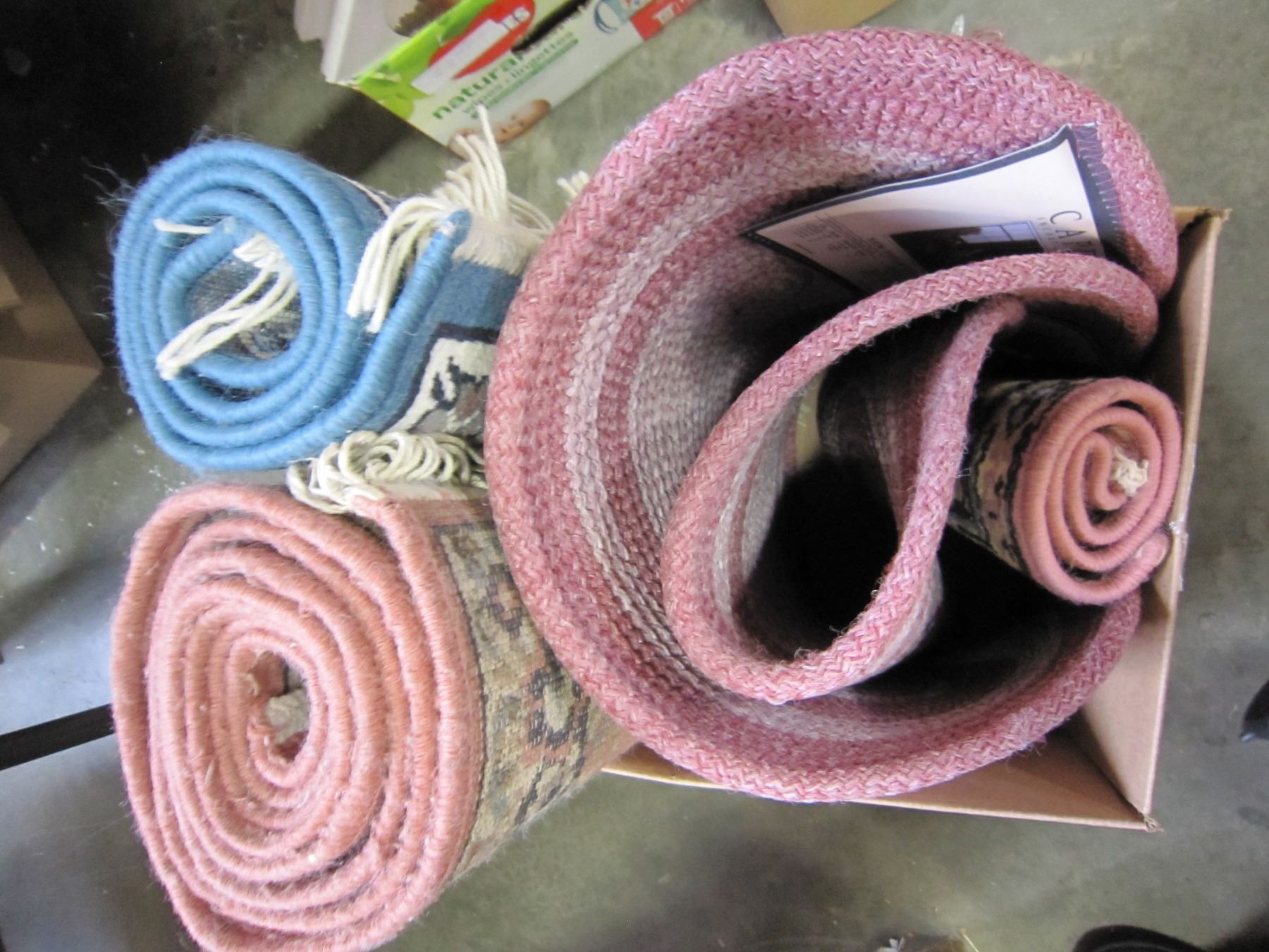 BOX OF CARPET RUNNERS, TABLE PROTECTOR, AND WOOL MATS NEW