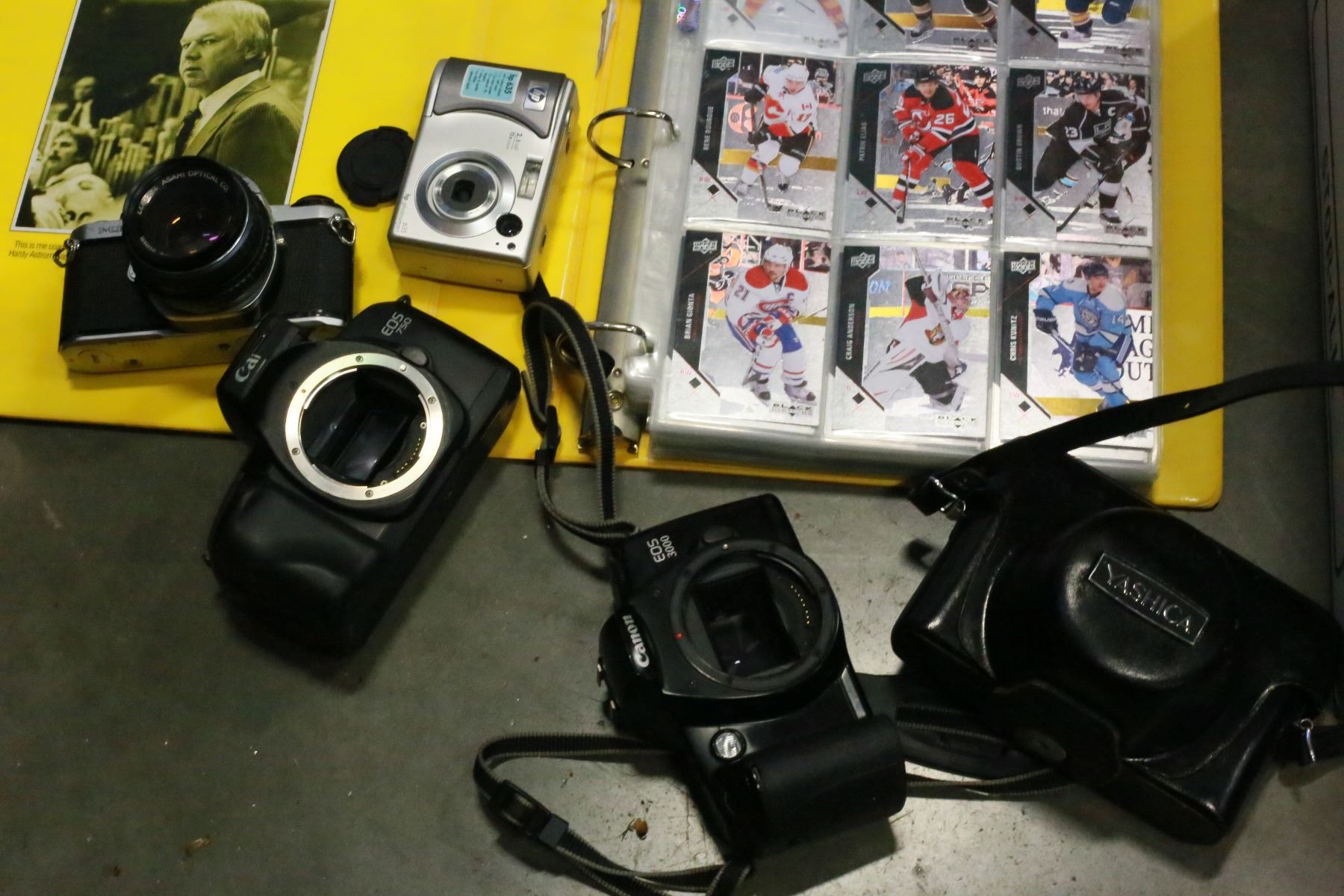 BOX OF CDS HOCKEY CARDS AND CAMERAS