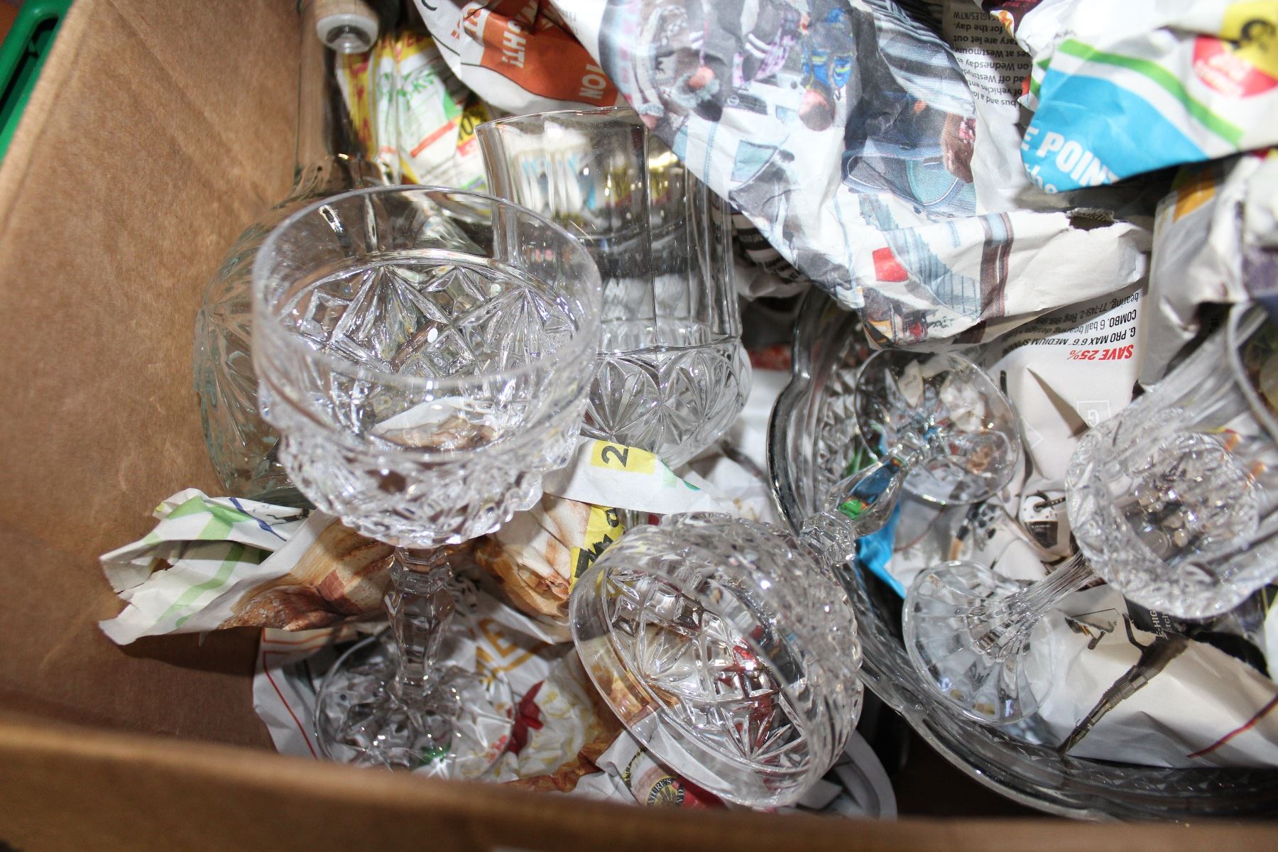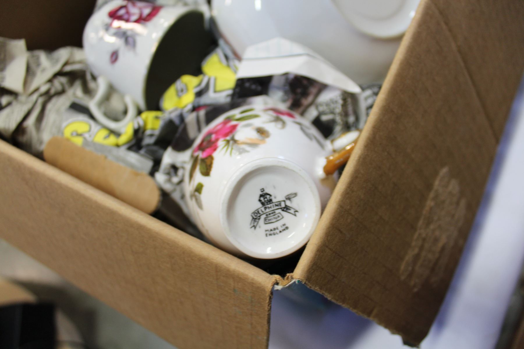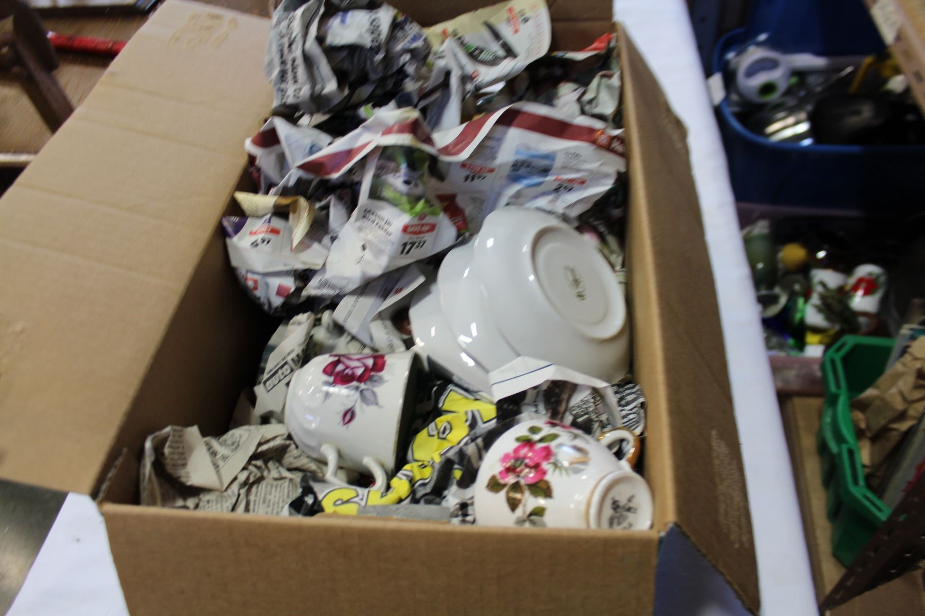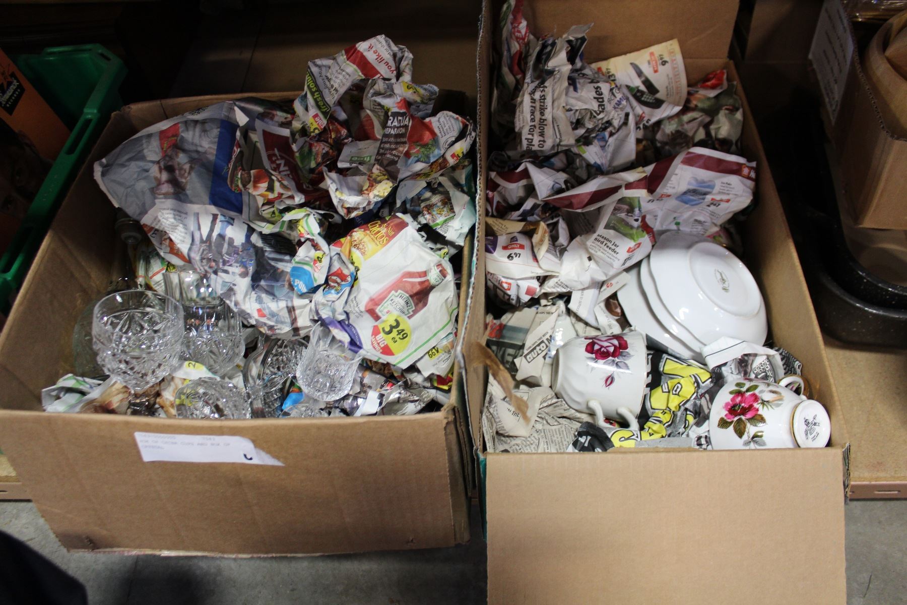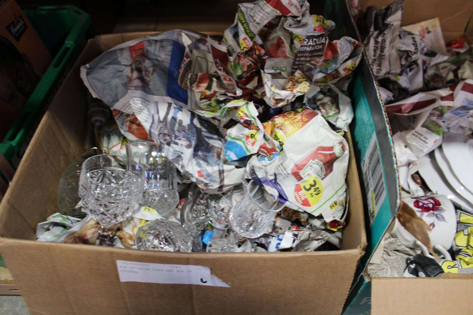 BOX OF CHINA CUPS AND BOX OF CRYSTAL