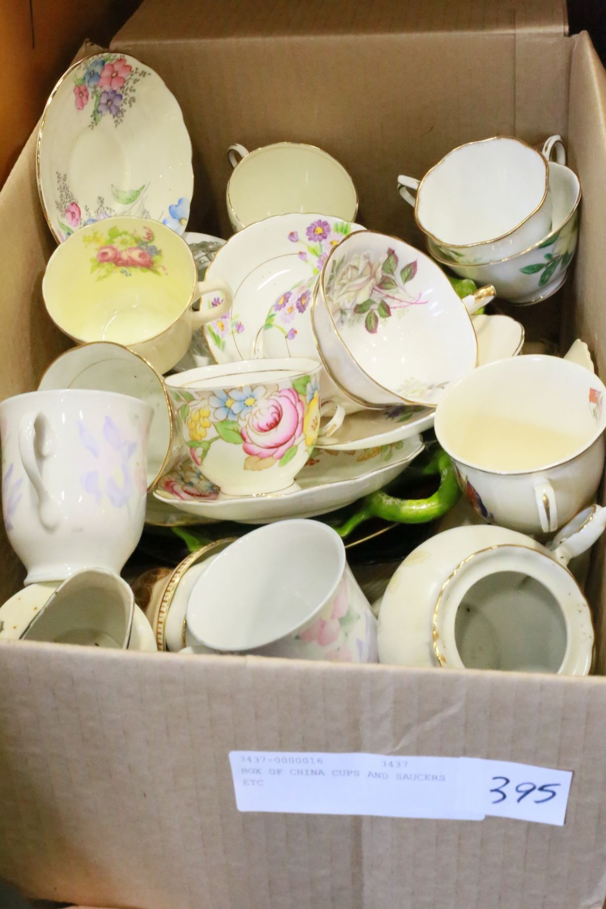 BOX OF CHINA CUPS AND SAUCERS ETC