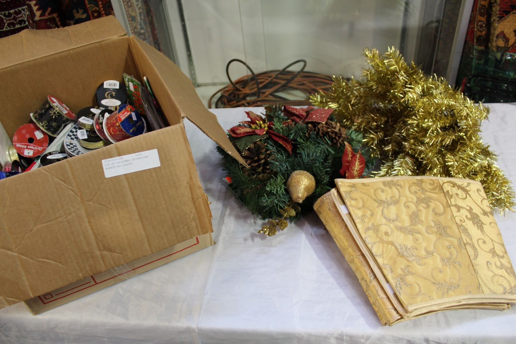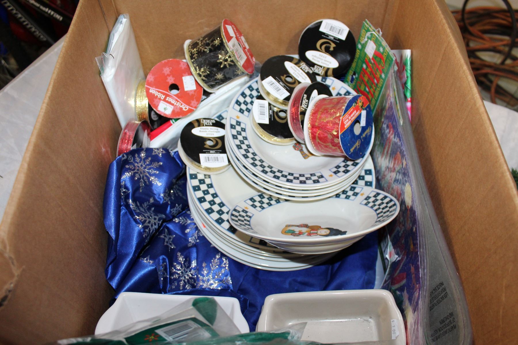 BOX OF CHRISTMAS DECORATIONS WREATH AND PLATES