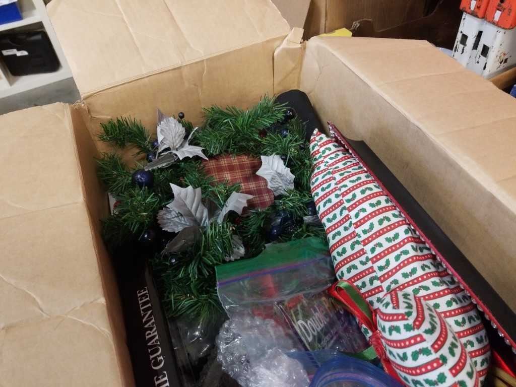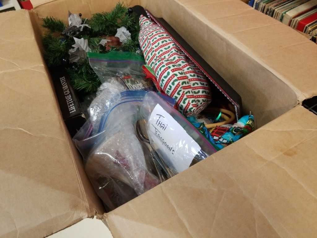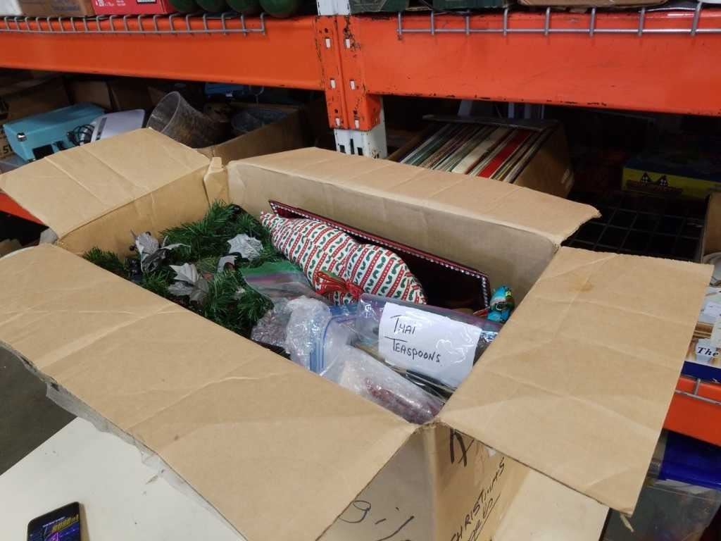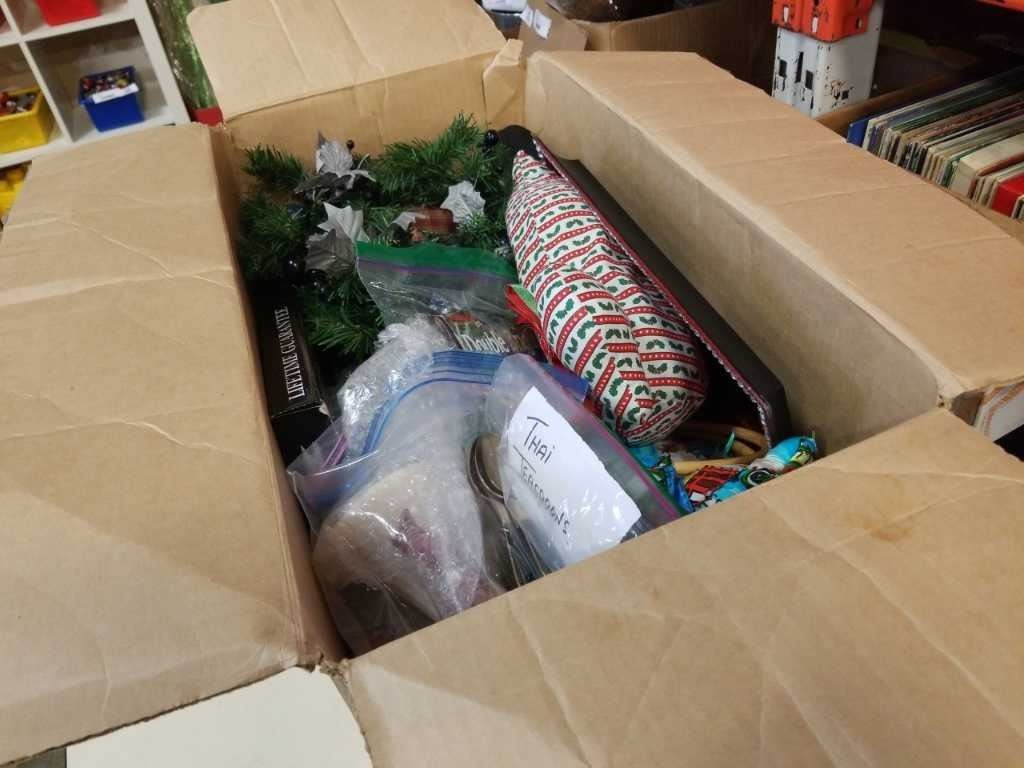BOX OF CHRISTMAS ORNAMENTS, DECOR AND ESTATE GOODS