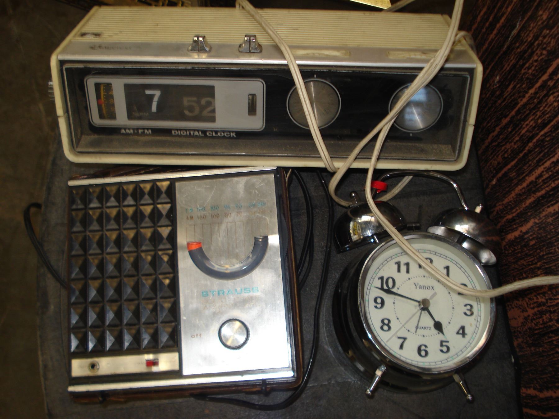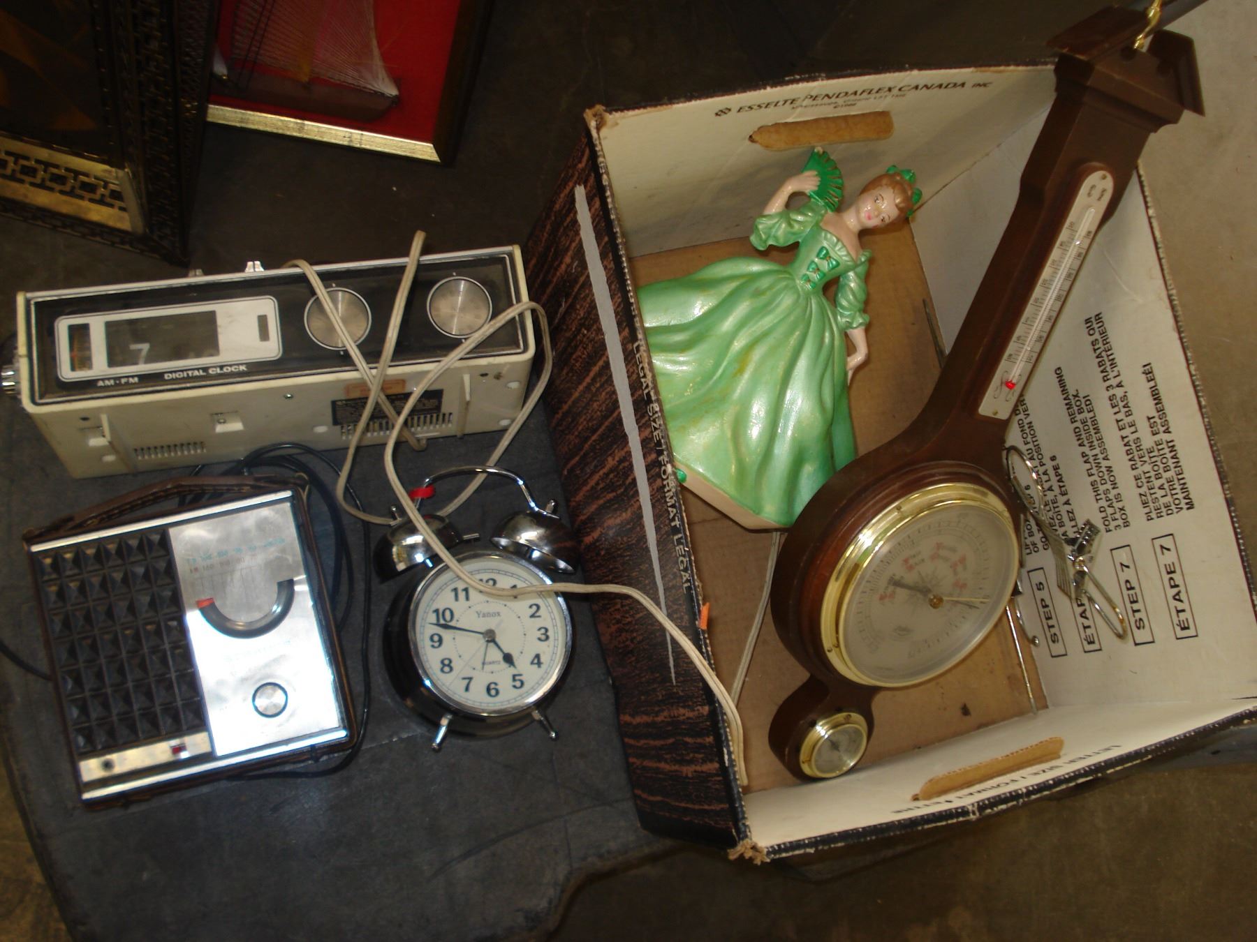 BOX OF CLOCKS, BAROMETER AND RADIO