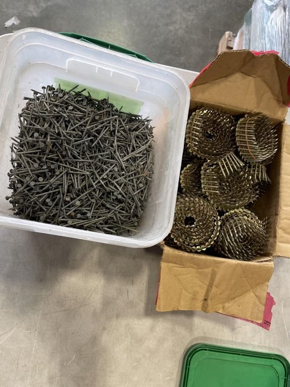 BOX OF COIL NAILS AND BUCKET OF NAILS