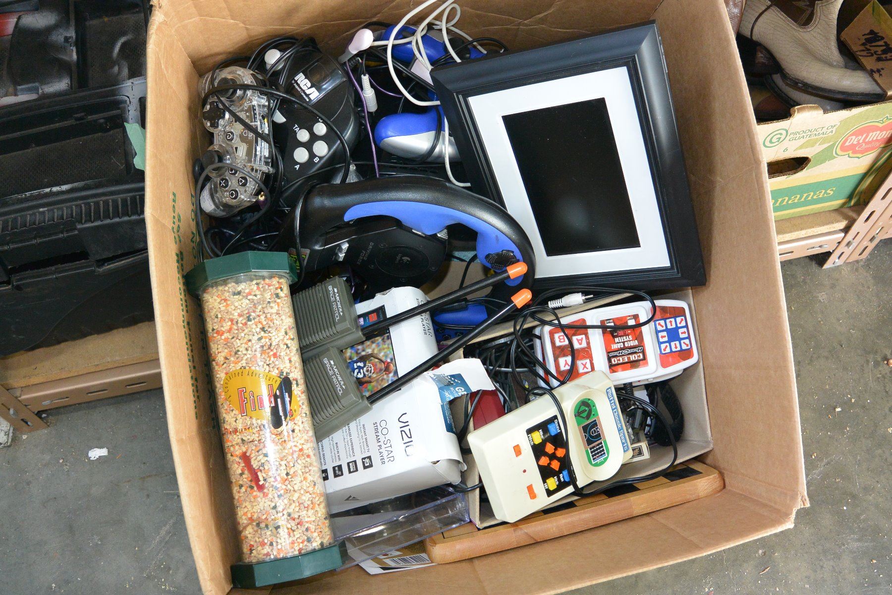 BOX OF COLECO MATTEL AND INTELLIVISION GAME CONTROLLERS AND ELECTRONICS