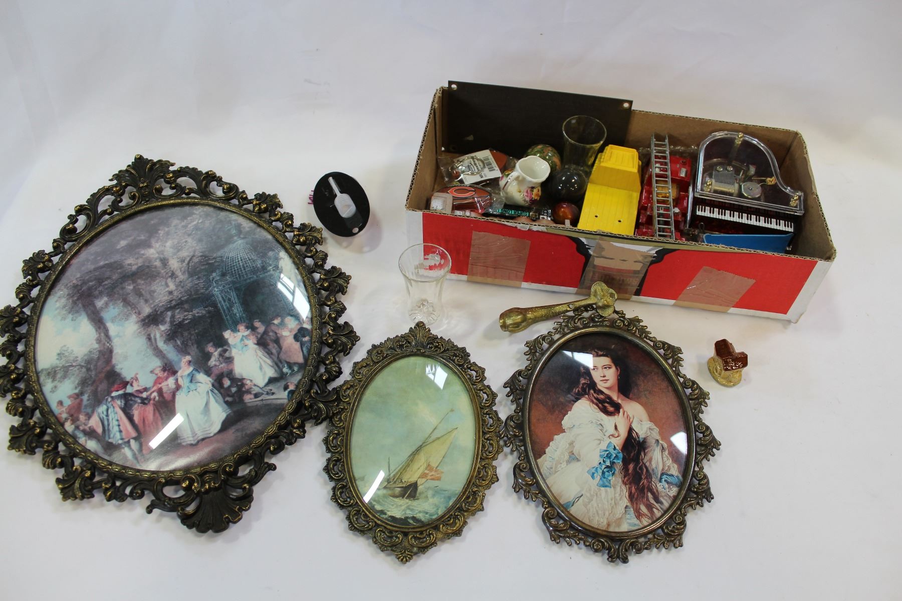 BOX OF COLLECTIBLE MINIATURES AND THREE VINTAGE OVAL FRAMES