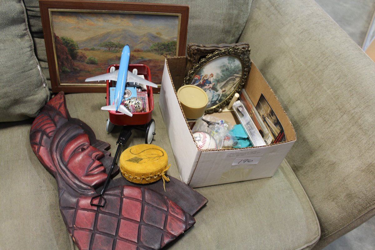 BOX OF COLLECTIBLES CARVED PLAQUES AND SMALL PICTURES ETC