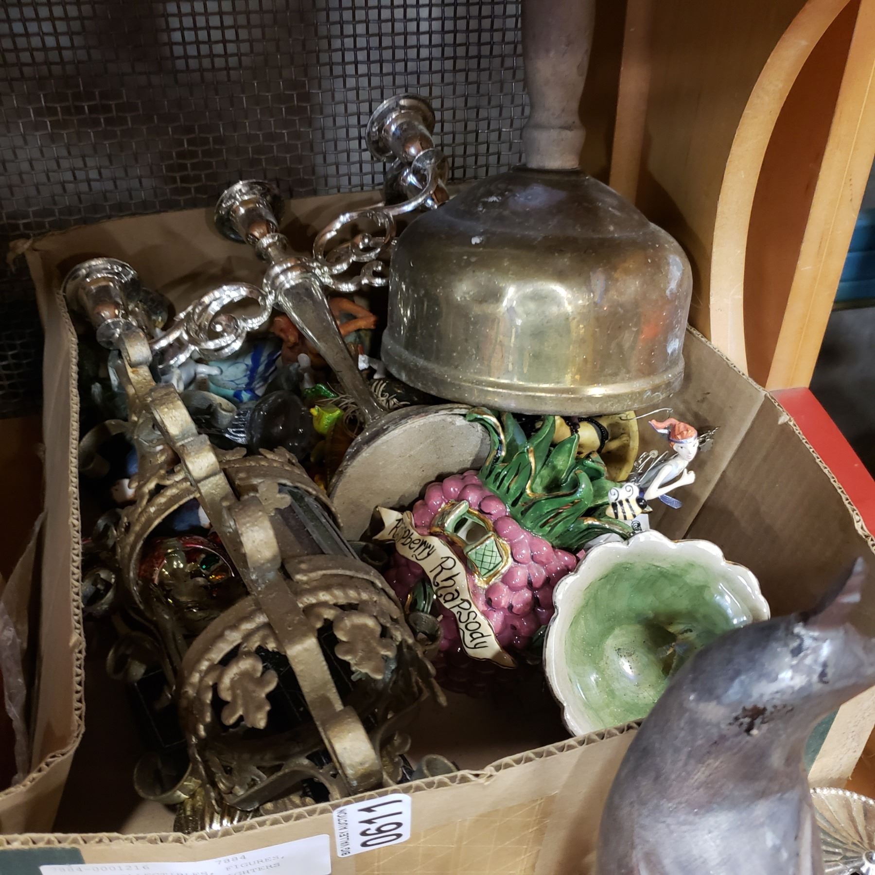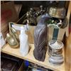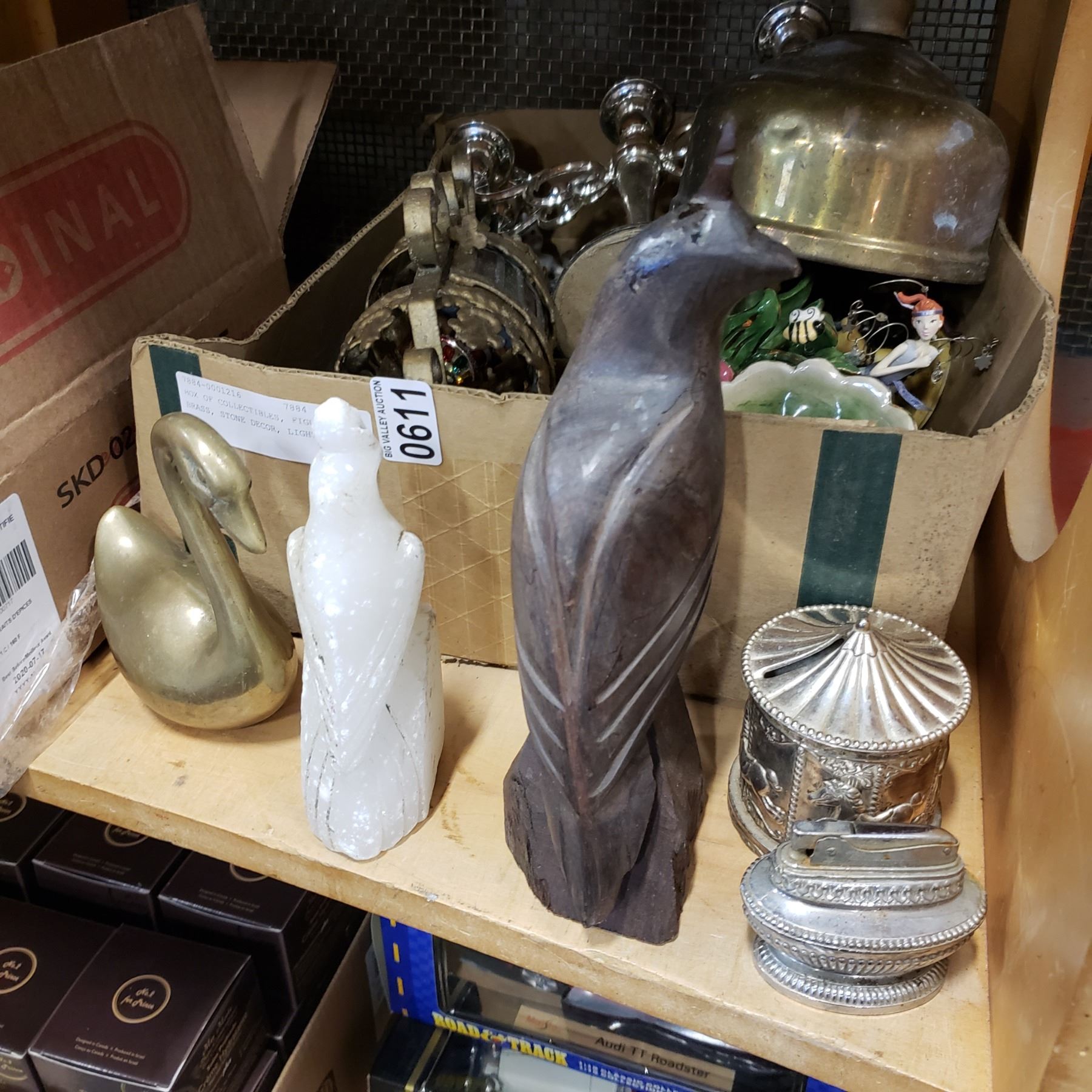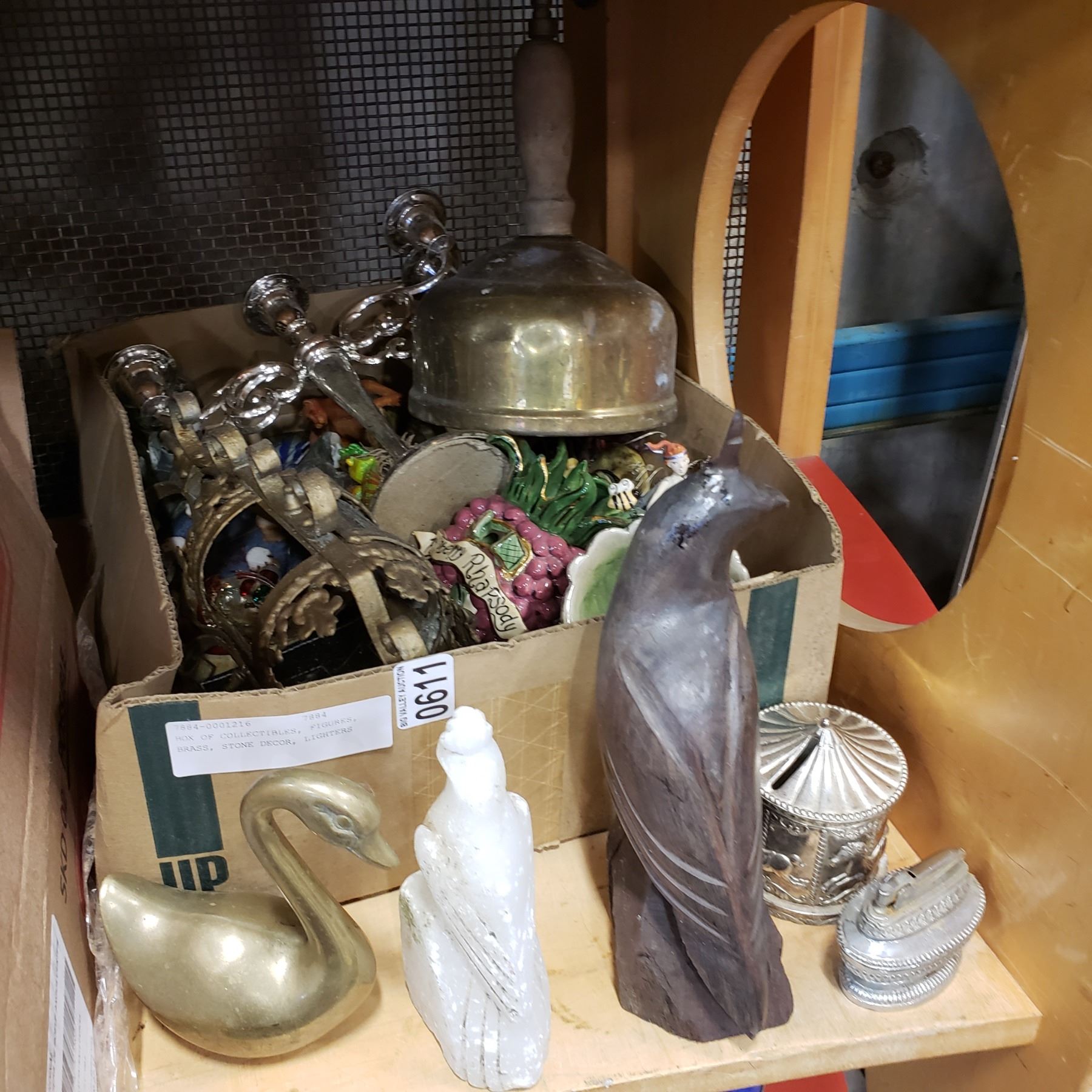 BOX OF COLLECTIBLES, FIGURES, BRASS, STONE DECOR, LIGHTERS