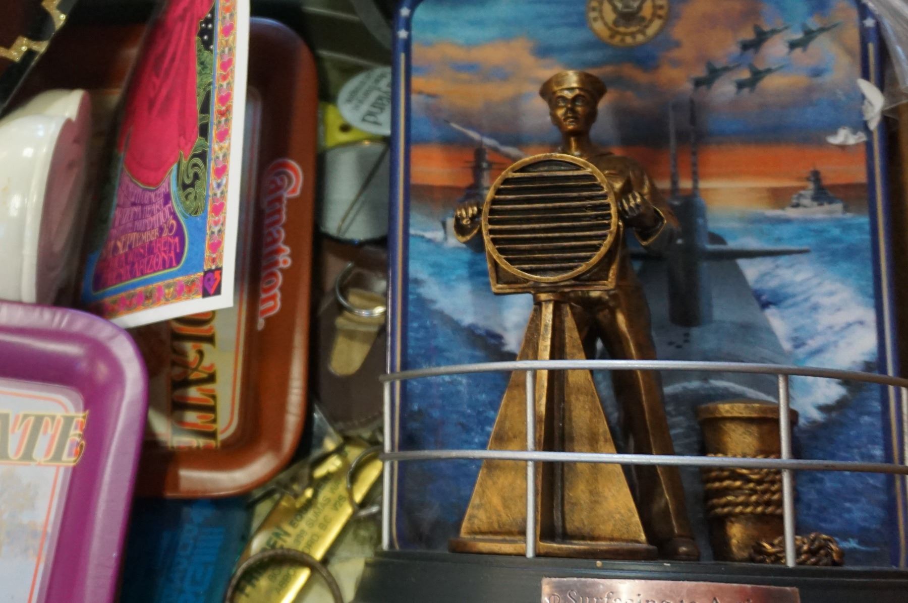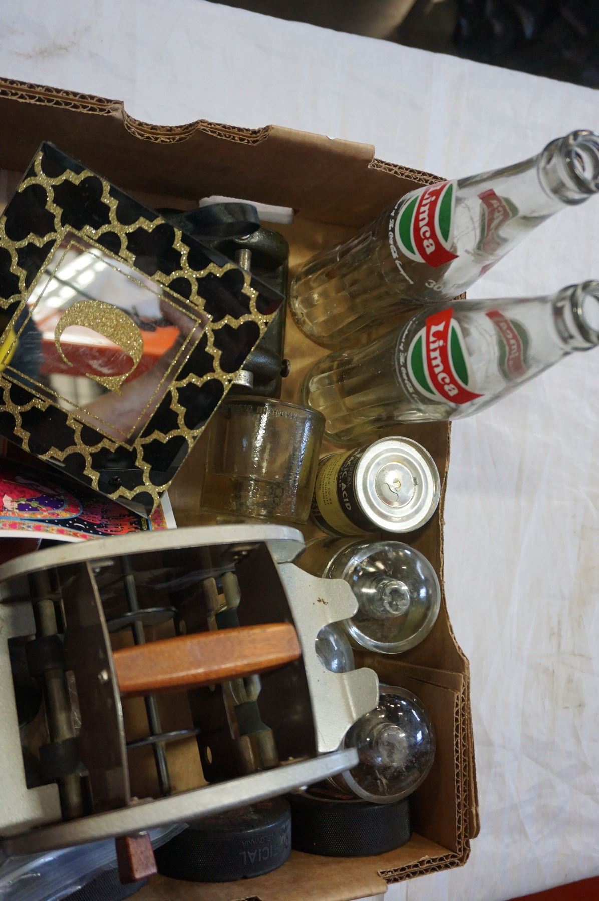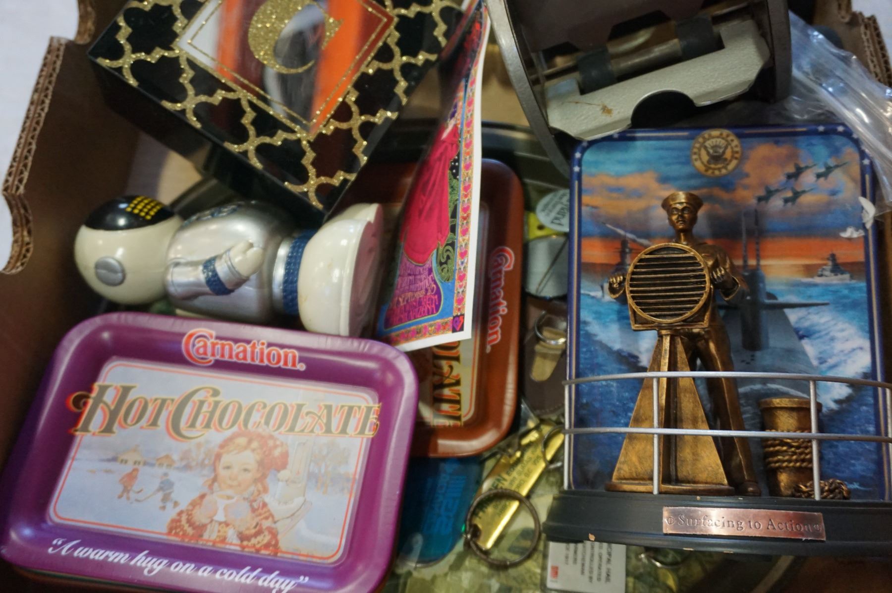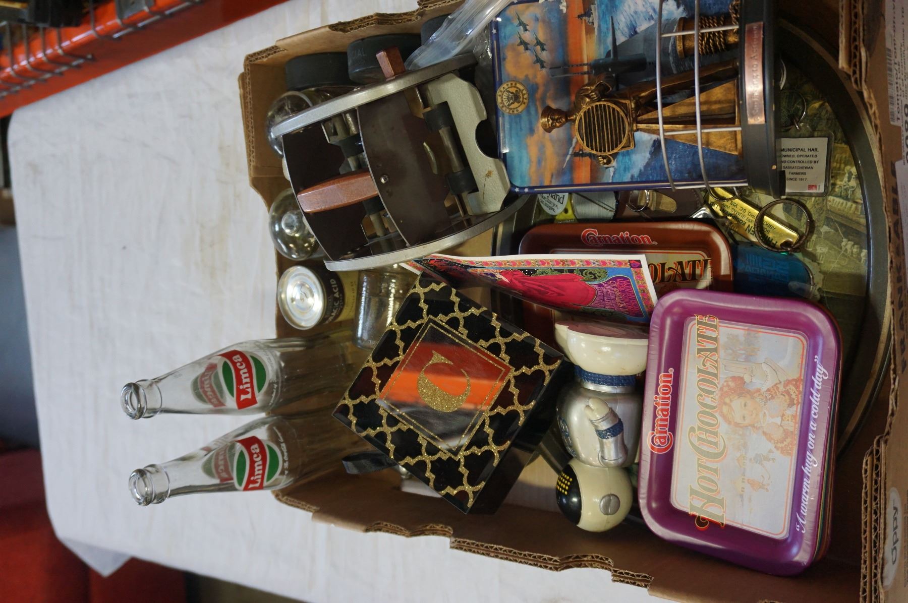 BOX OF COLLECTIBLES INCLUDIHNG VINTAGE CARD SHUFFLER AND TIN TRAYS
