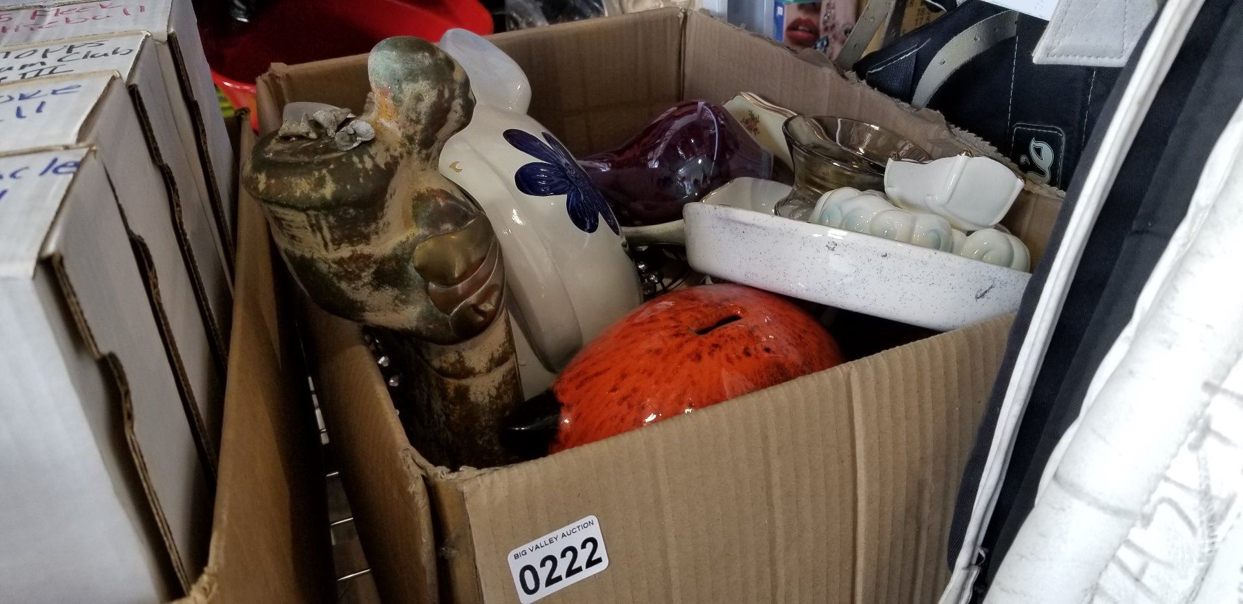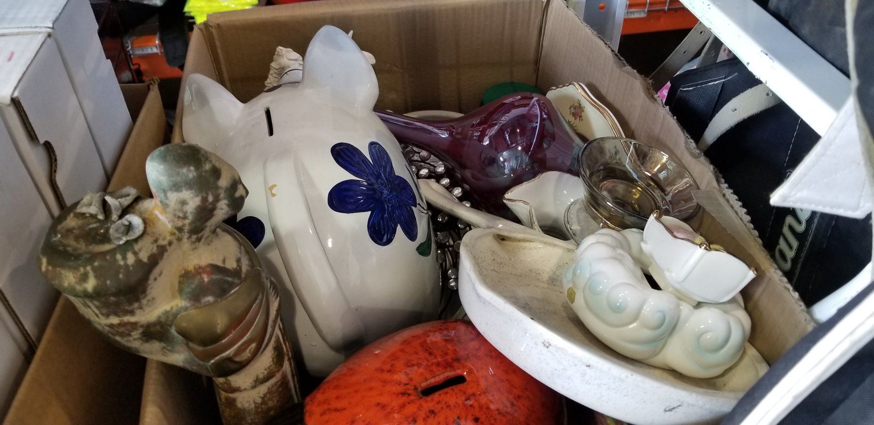 BOX OF COLLECTIBLES, PIGGY BANKS, GLASSWARE, AND CHINA