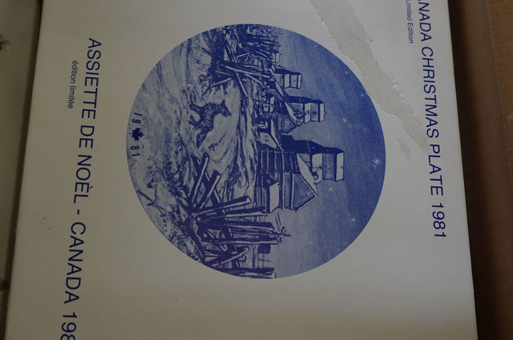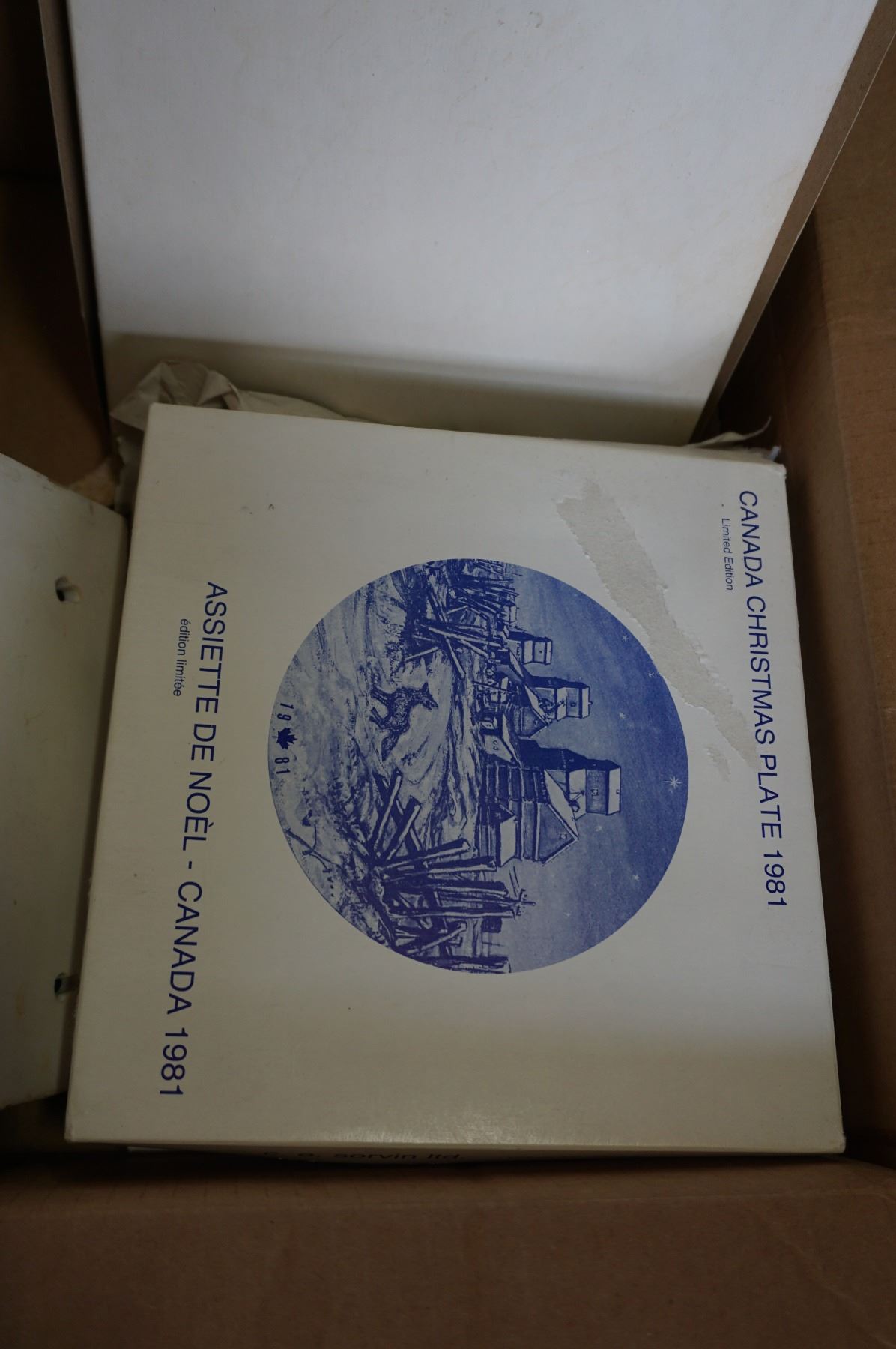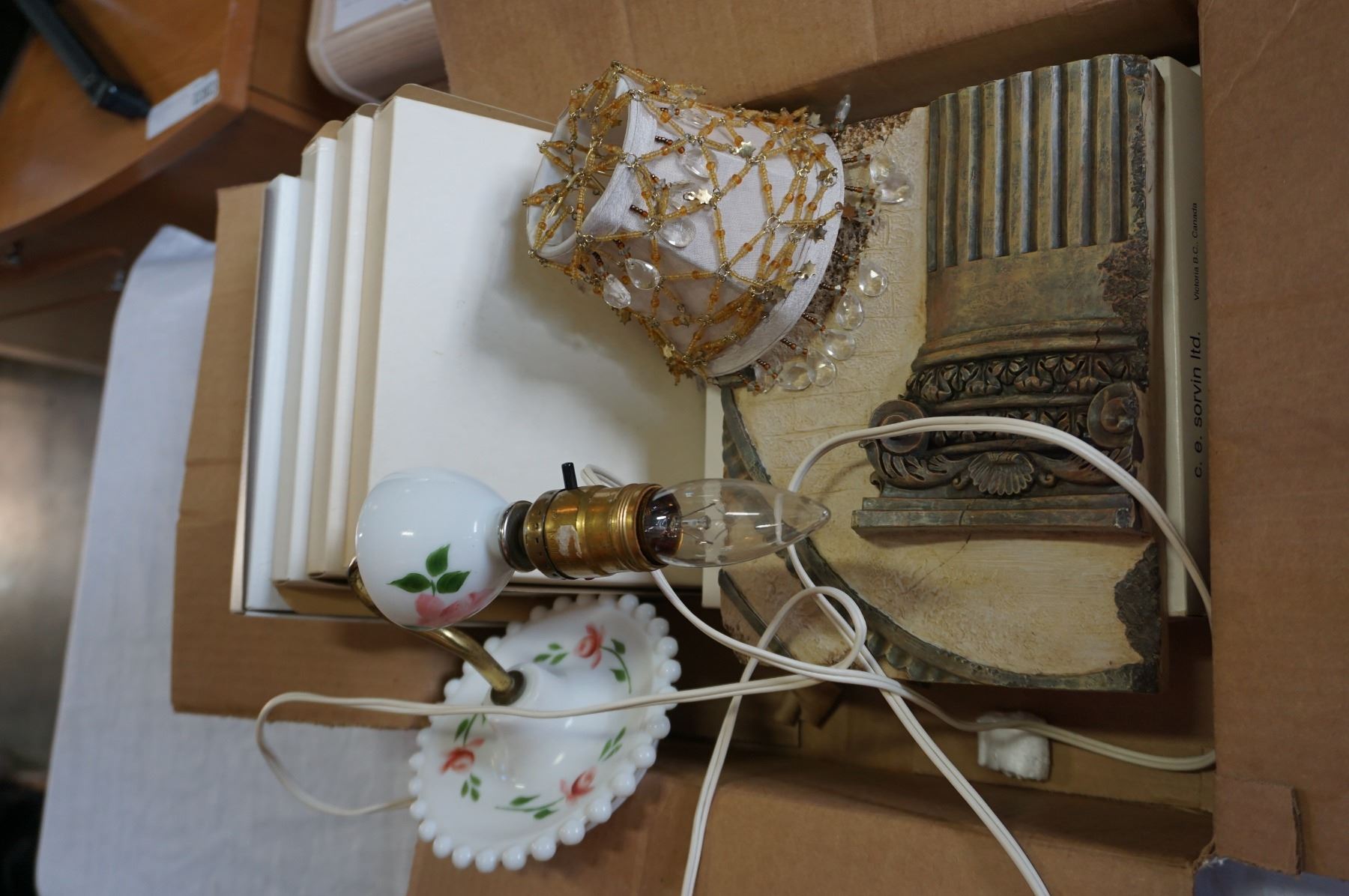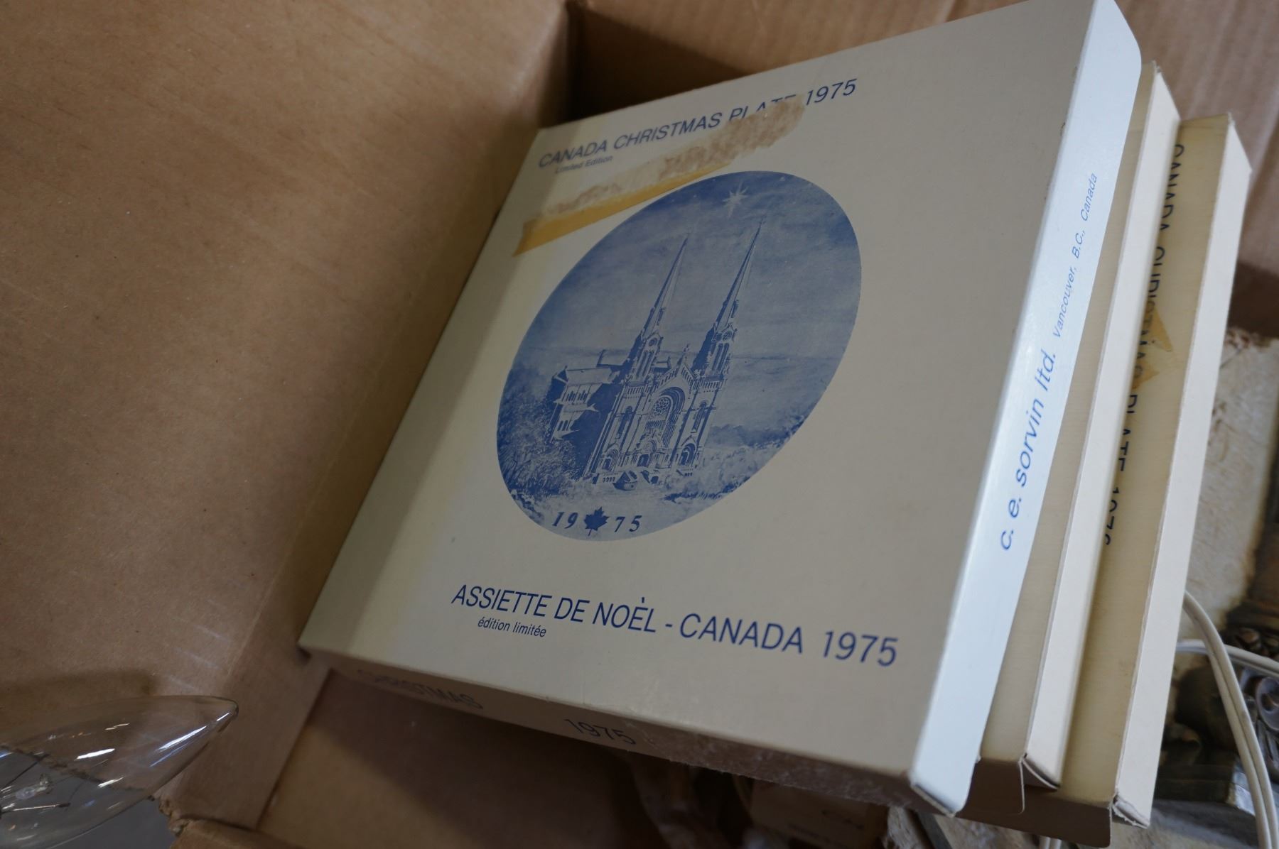 BOX OF COLLECTOR PLATES AND VINTAGE WALL LAMP