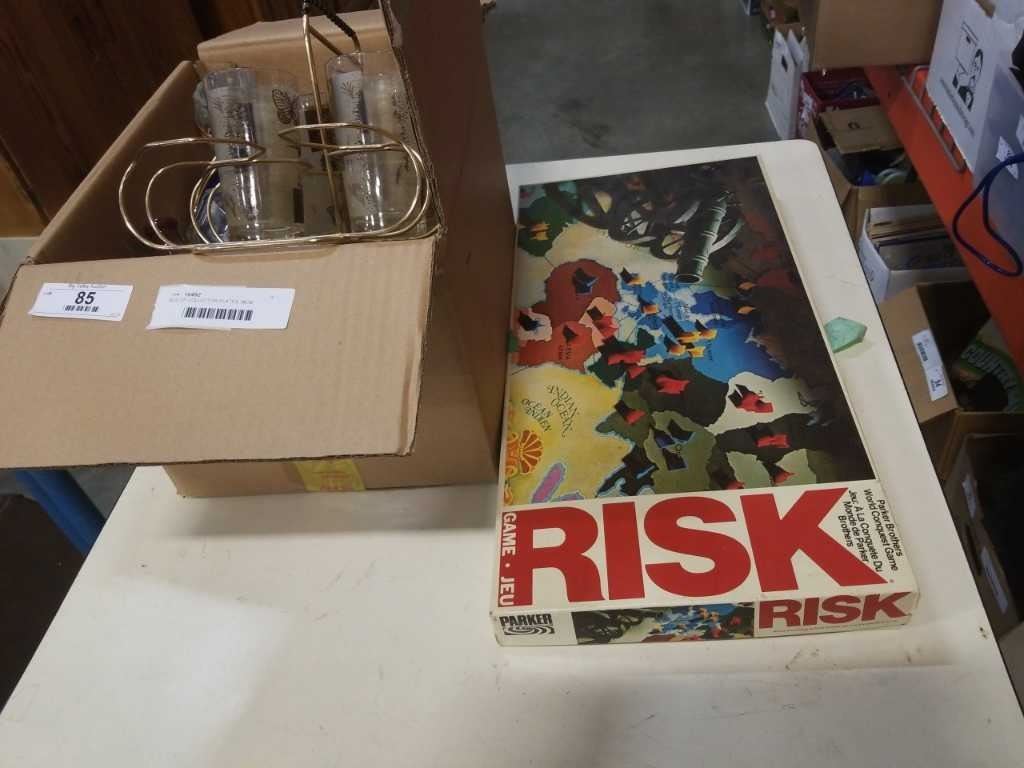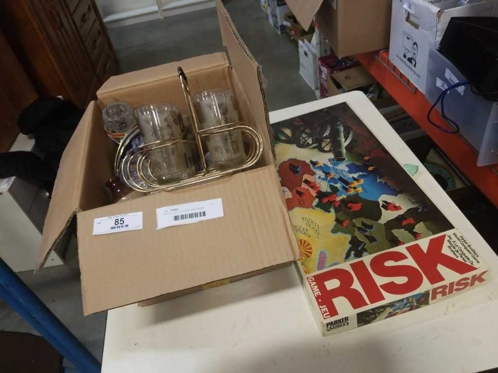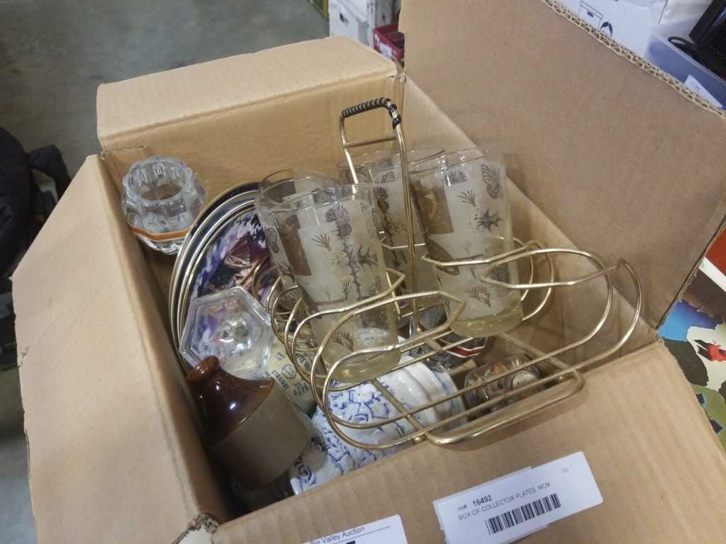BOX OF COLLECTOR PLATES, MCM GLASSES ON STAND, SMALL WHISKEY JUGS, RISK BOARD GAME