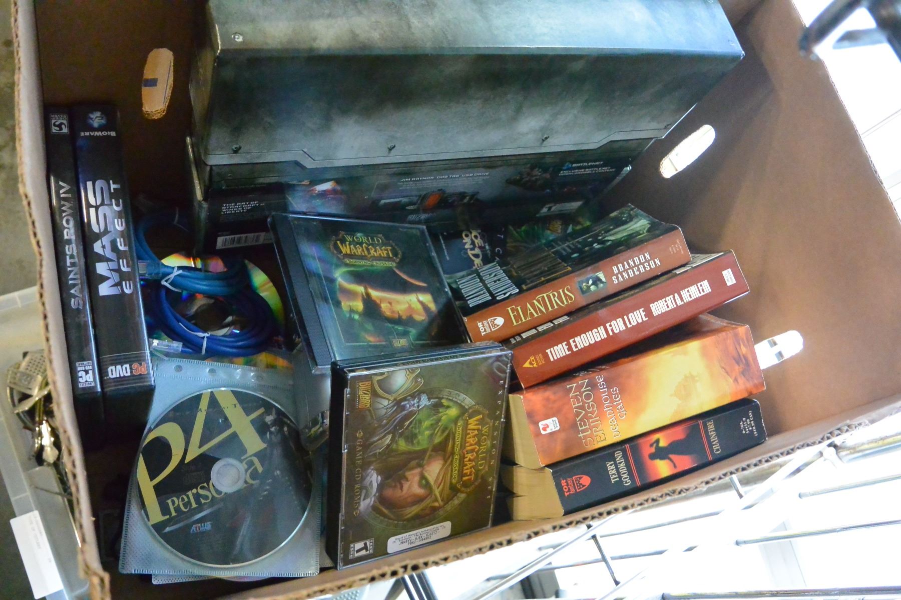 BOX OF COMPUTER GAMES, LEATHER BAG, AND NOVELS