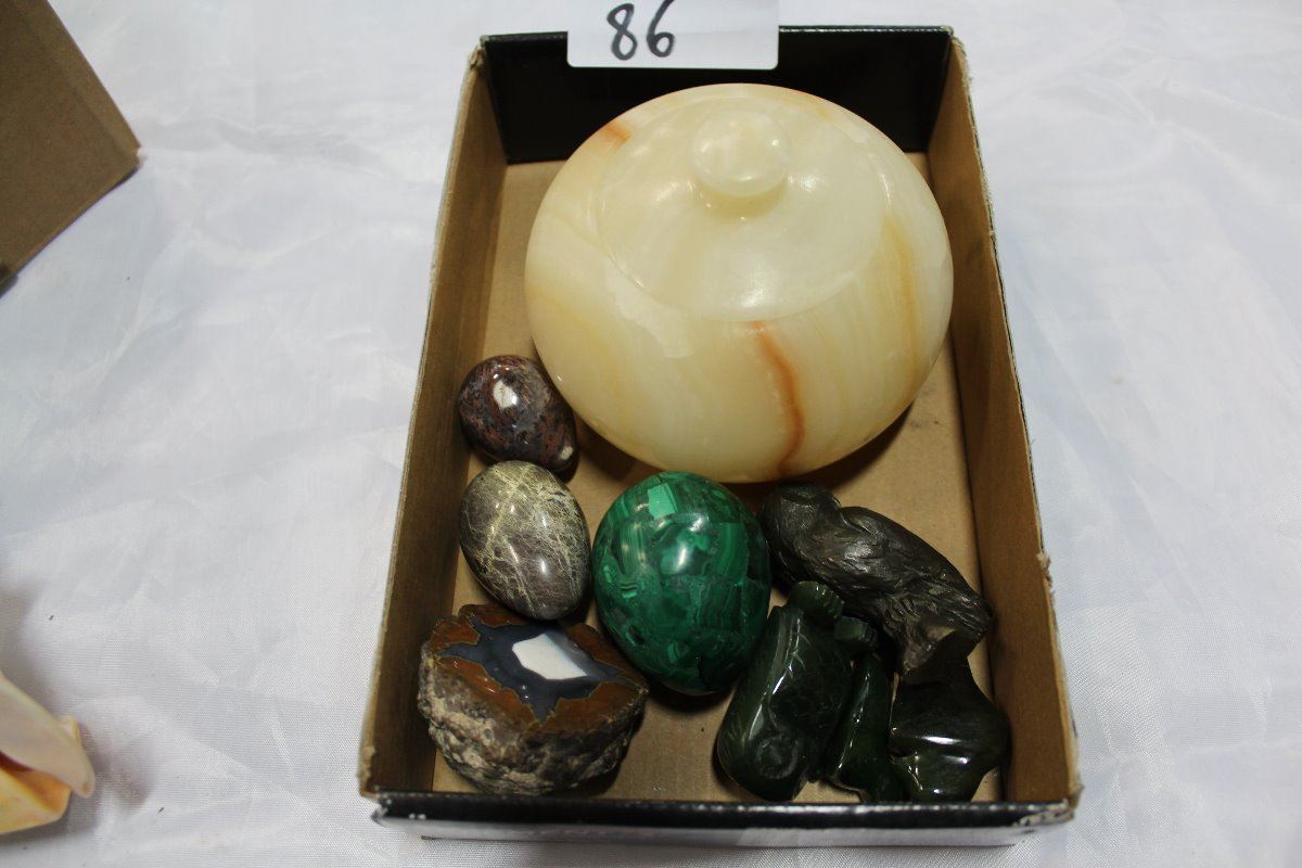 BOX OF CONCH SHELLS AND LOT OF STONE ITEMS