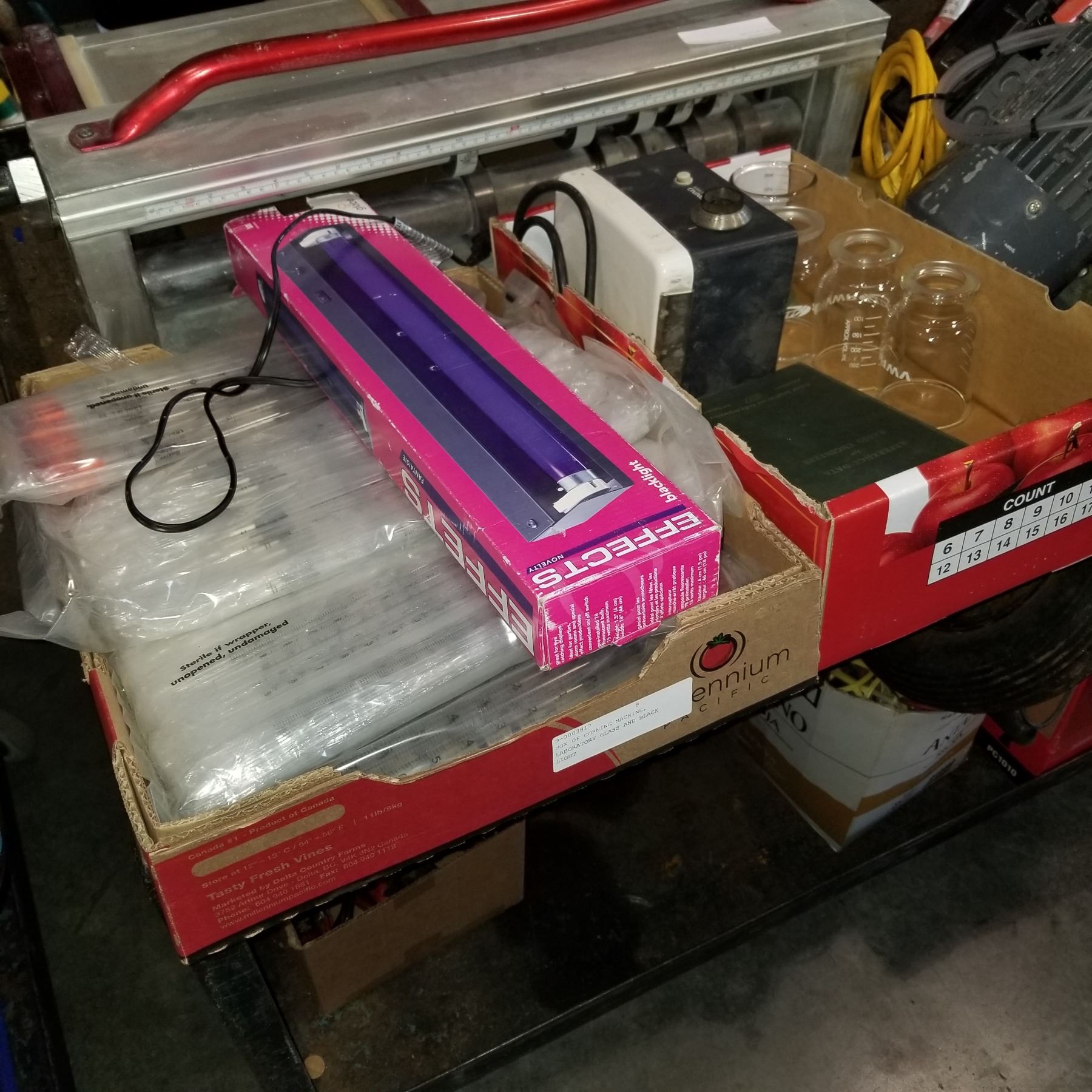 BOX OF CORNING MACHINE, LABORATORY GLASS AND BLACK LIGHT