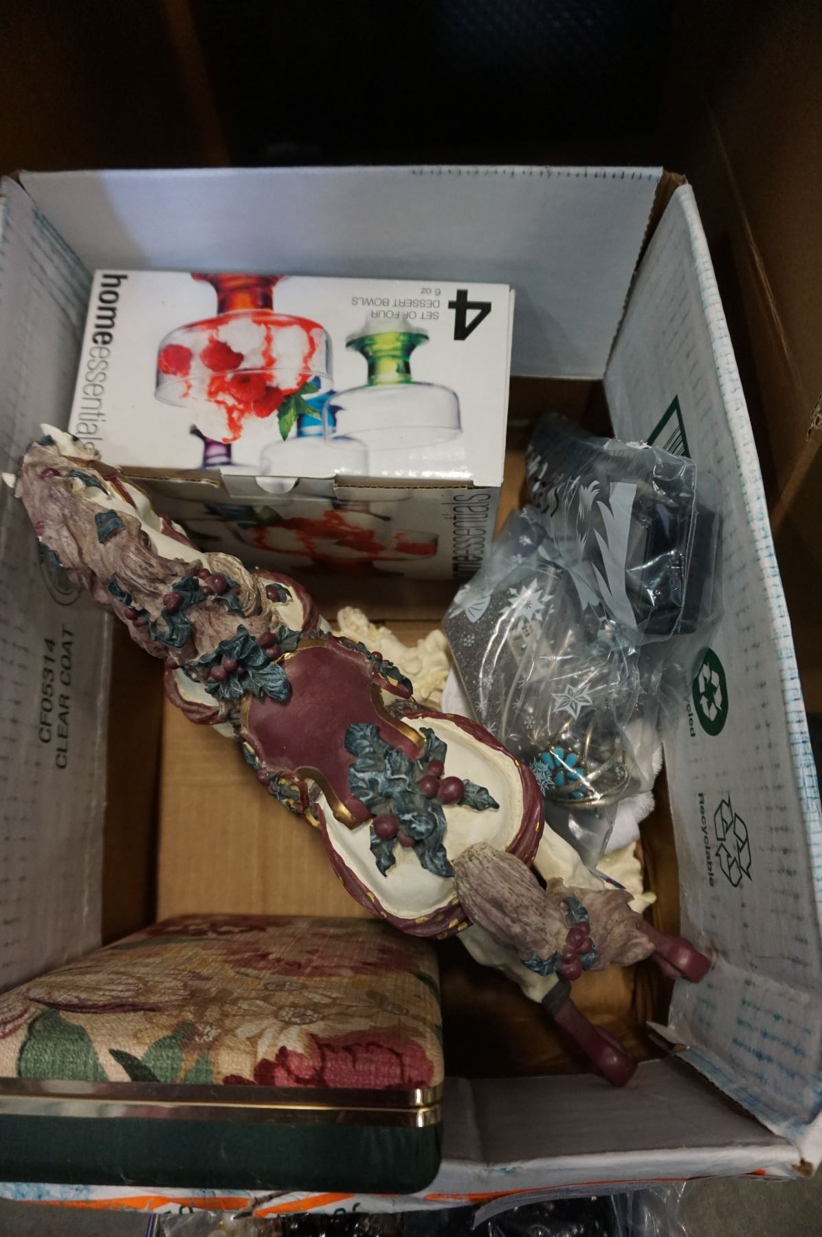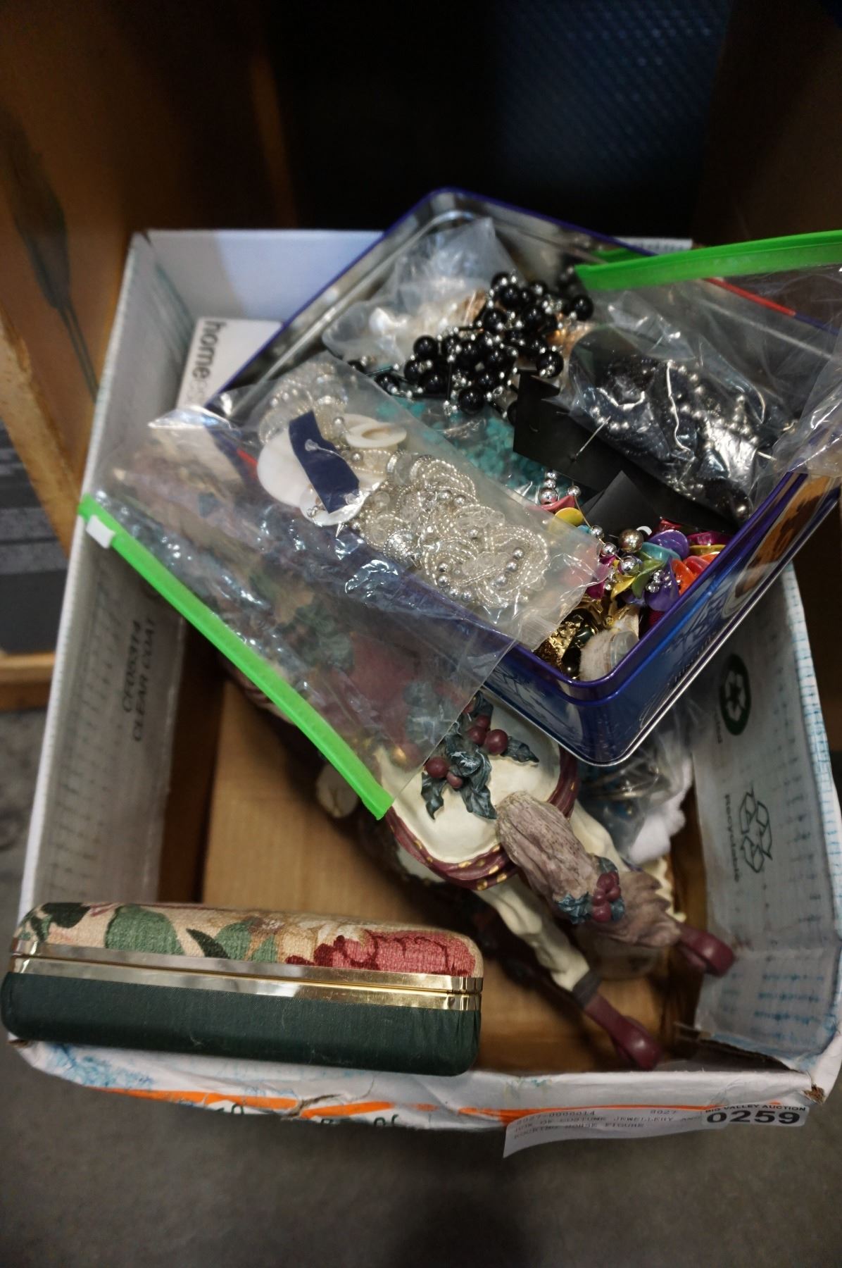 BOX OF COSTUME JEWELLERY AND ROCKING HORSE FIGURE