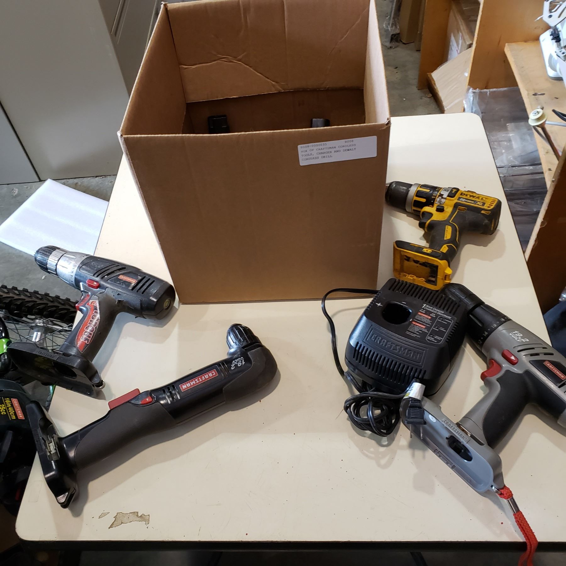 BOX OF CRAFTSMAN CORDLESS TOOLS, CHARGER AND DEWALT CORDLESS DRILL
