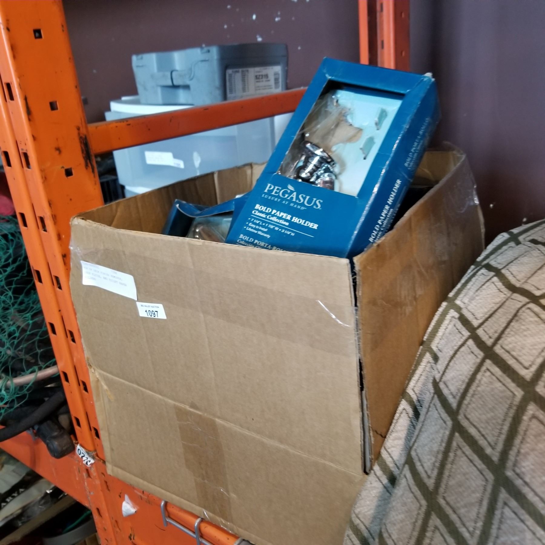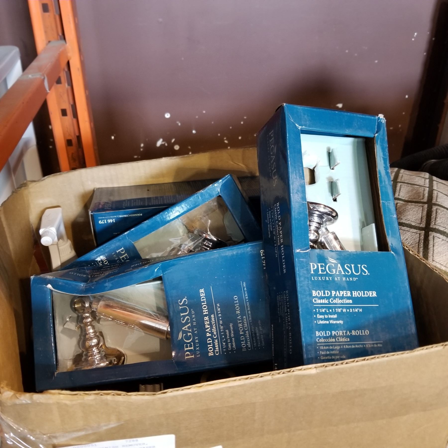 BOX OF DECK FINISH REMOVER, SHOP FLUIDS, AND TOILET PAPER HOLDERS