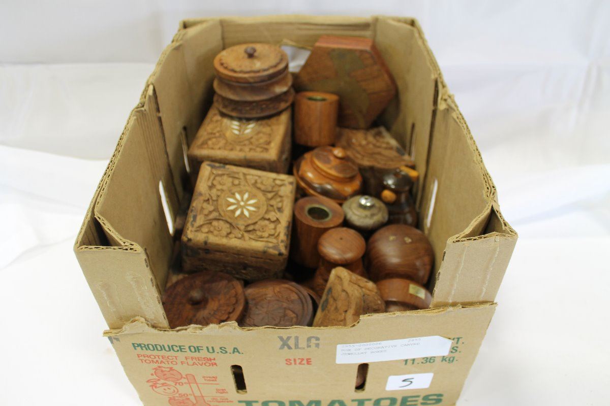 BOX OF DECORATIVE CARVED JEWELLRY BOXES
