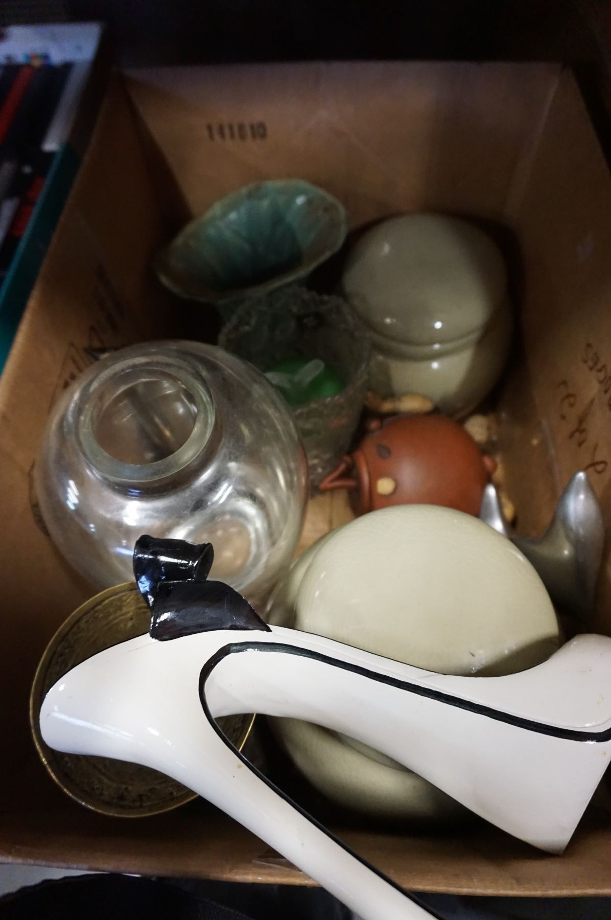 BOX OF DECORATIVE HOUSEWARES AND MCCOY POTTERY VASE